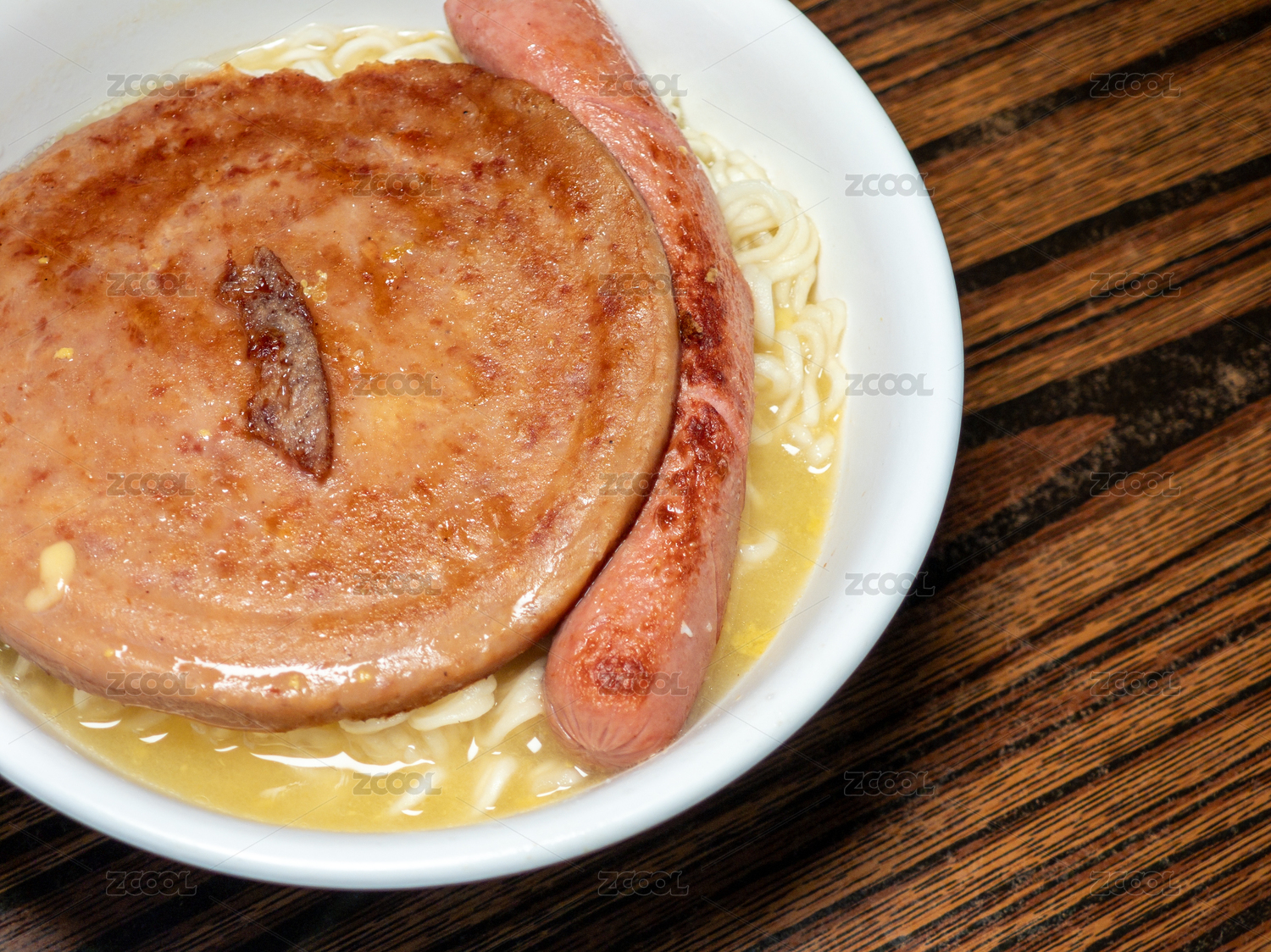 餐桌上的午餐肉方便面和凍奶茶