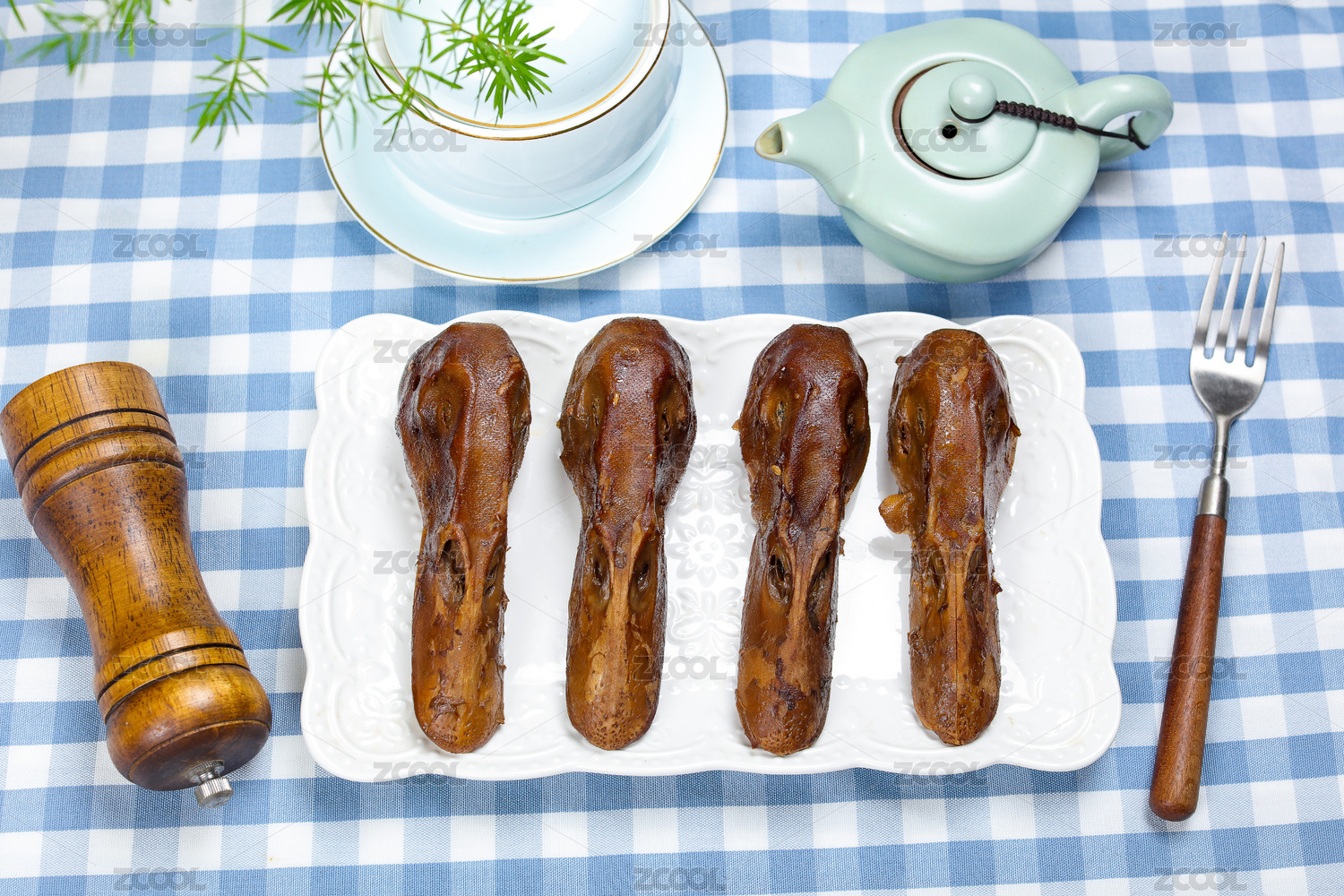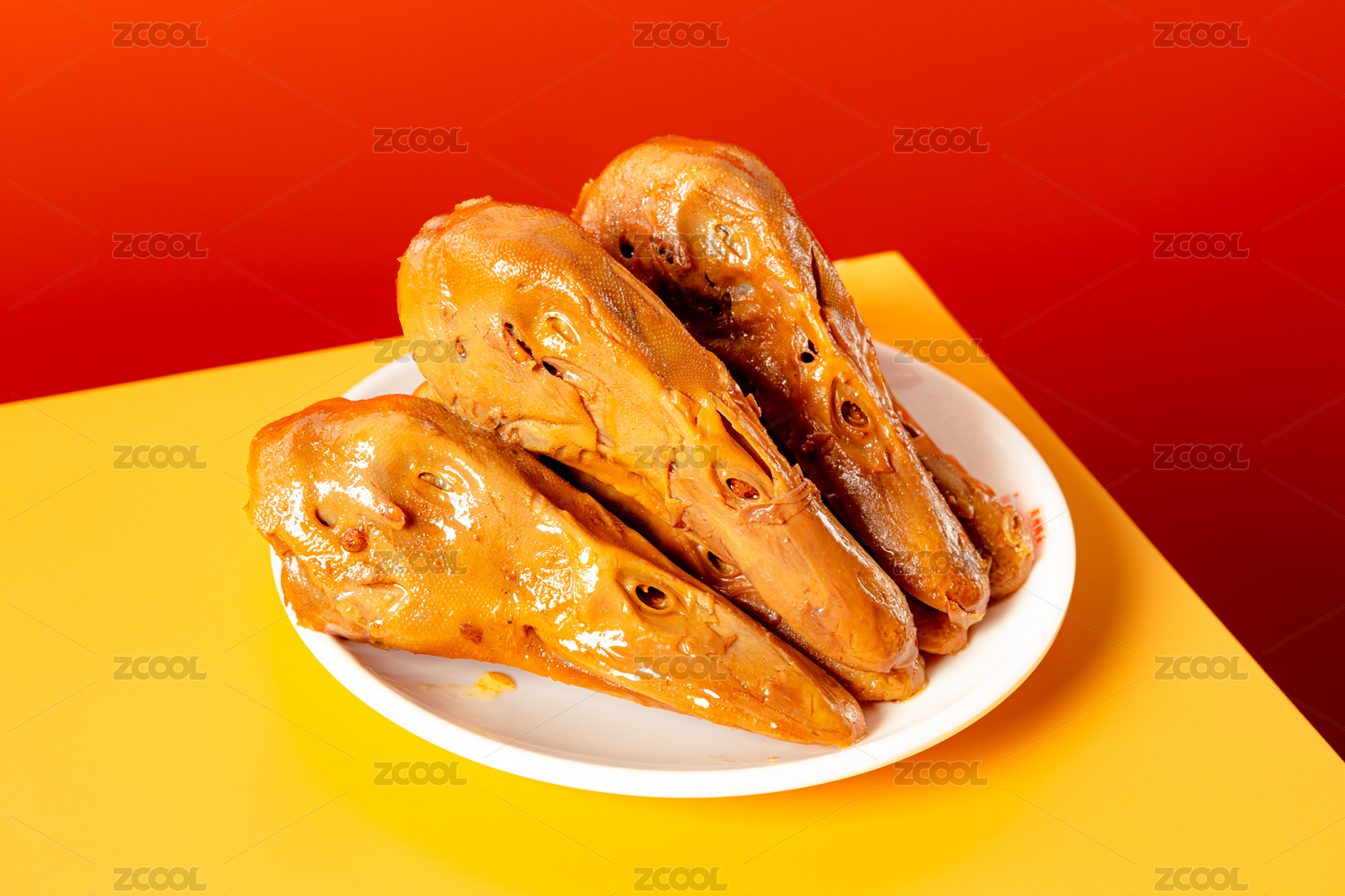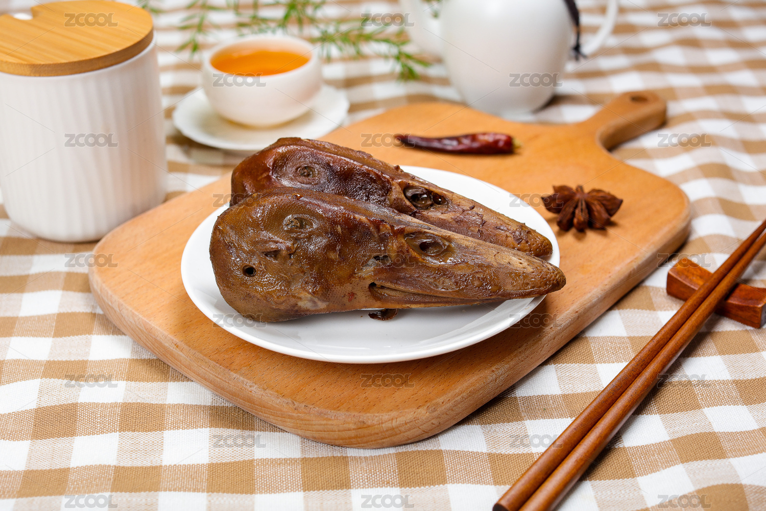 餐桌背景上的鹵鴨頭