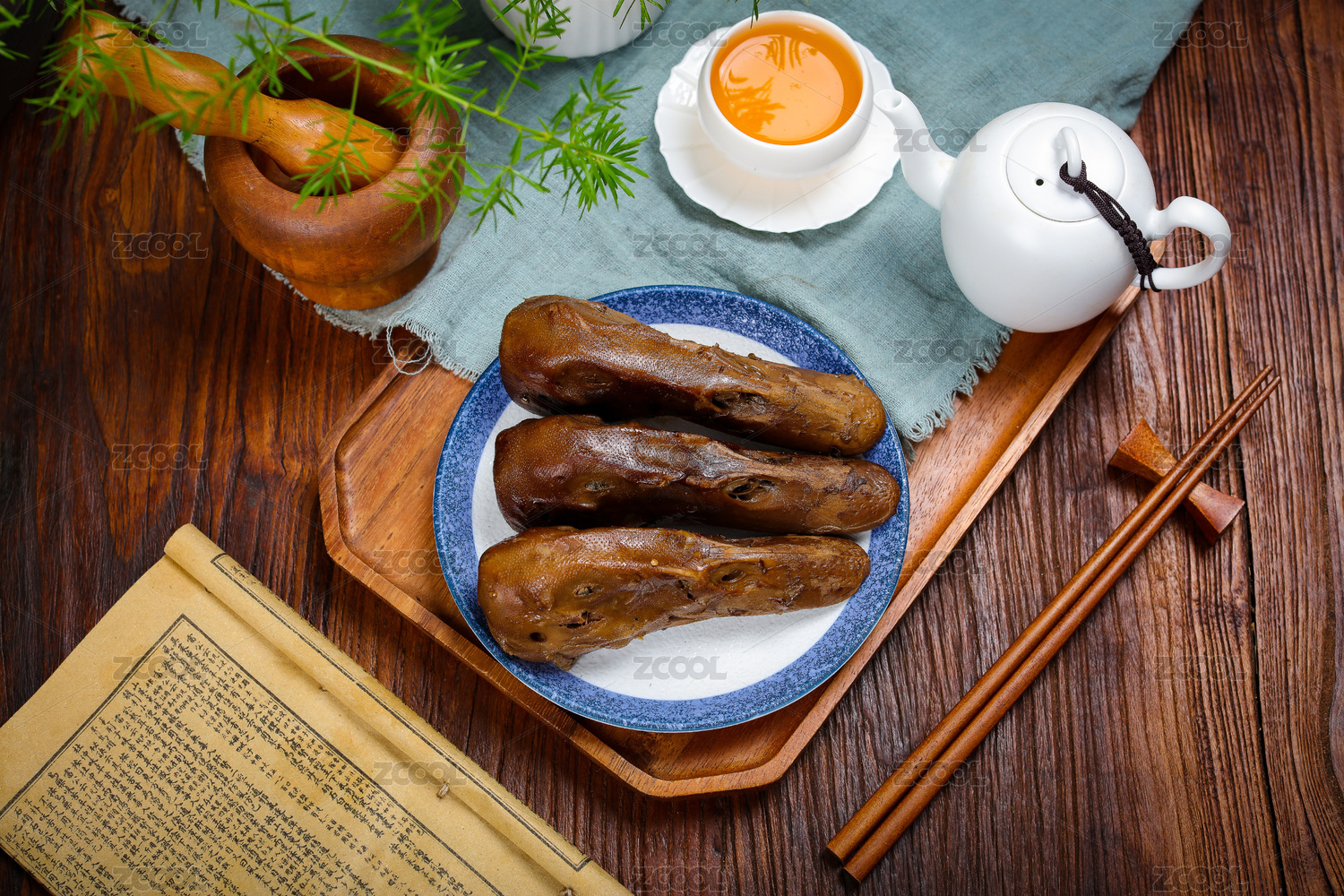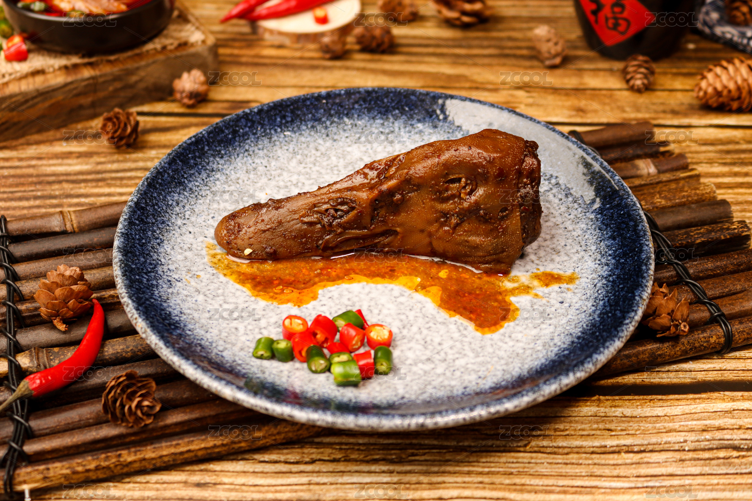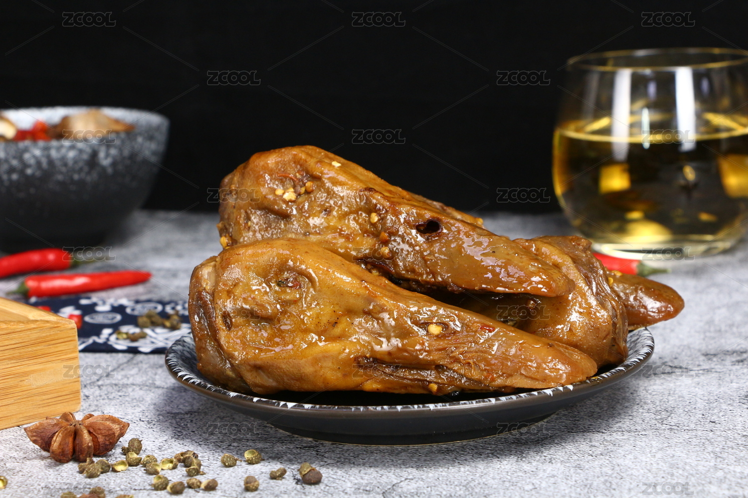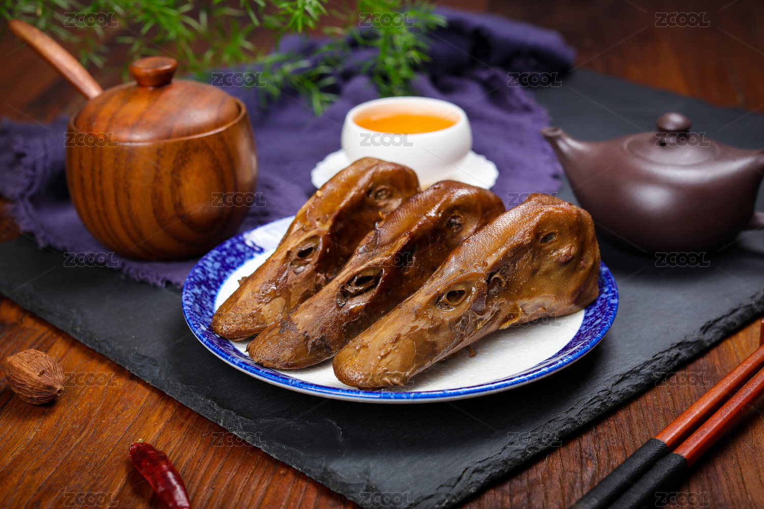 餐桌背景上的鹵鴨頭