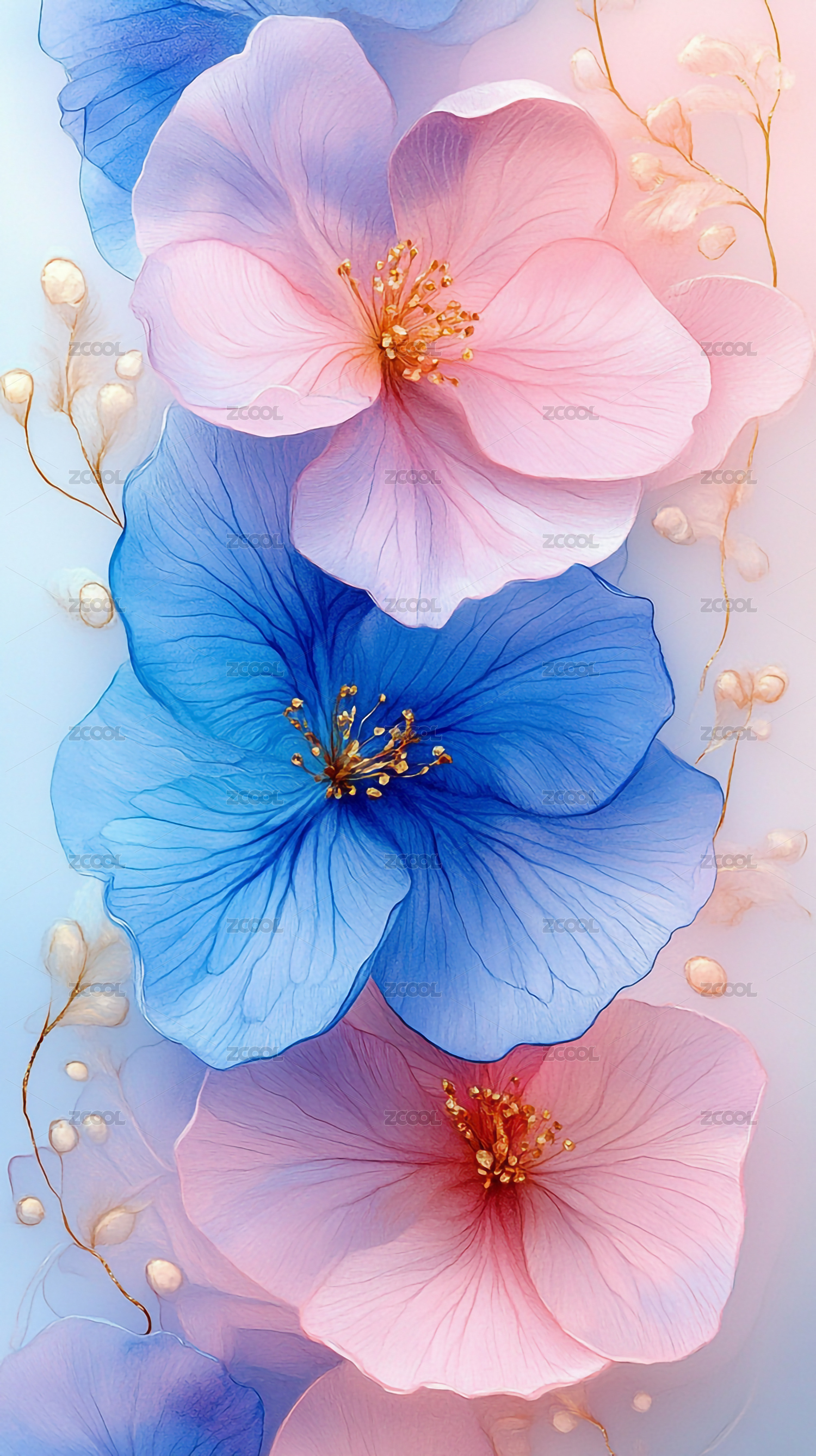 粉色背景紅色絲帶藍色葉子花瓣背景插畫