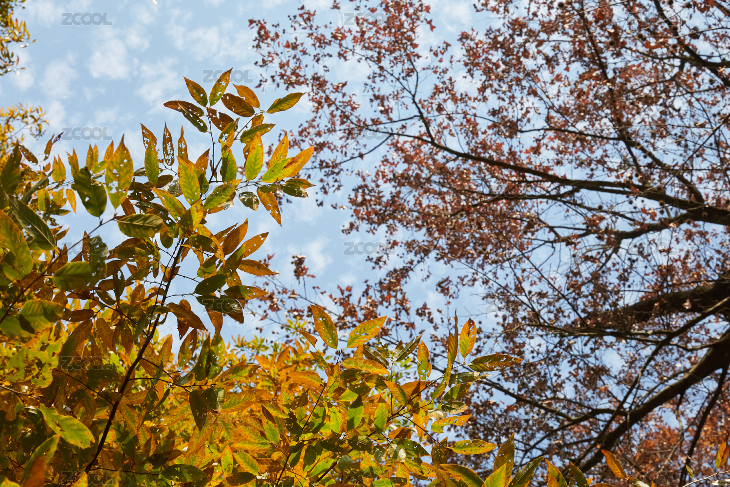 秋天藍天下枯黃的樹葉