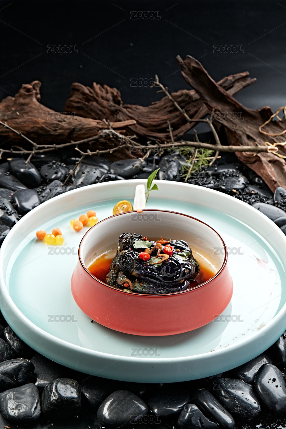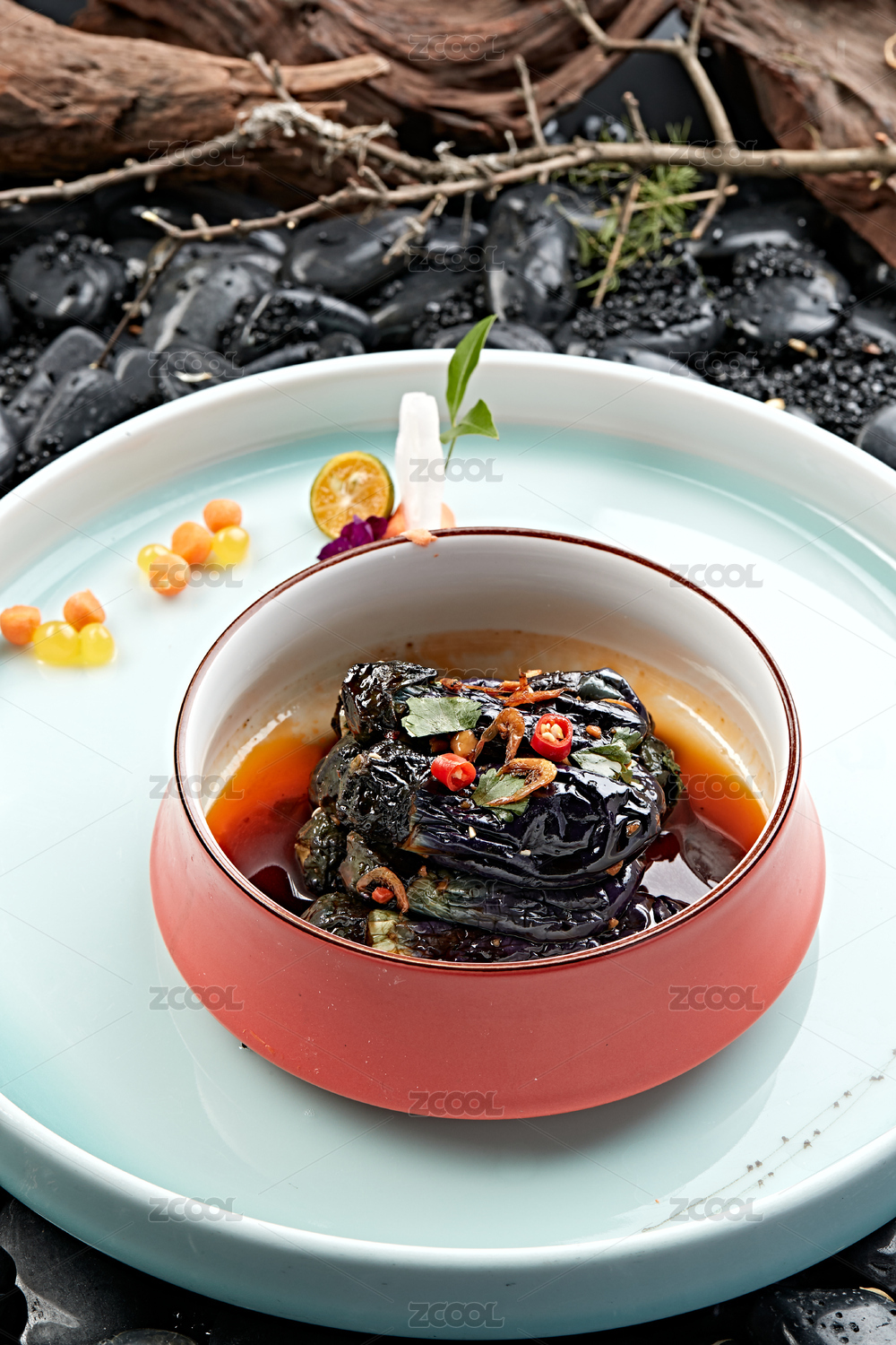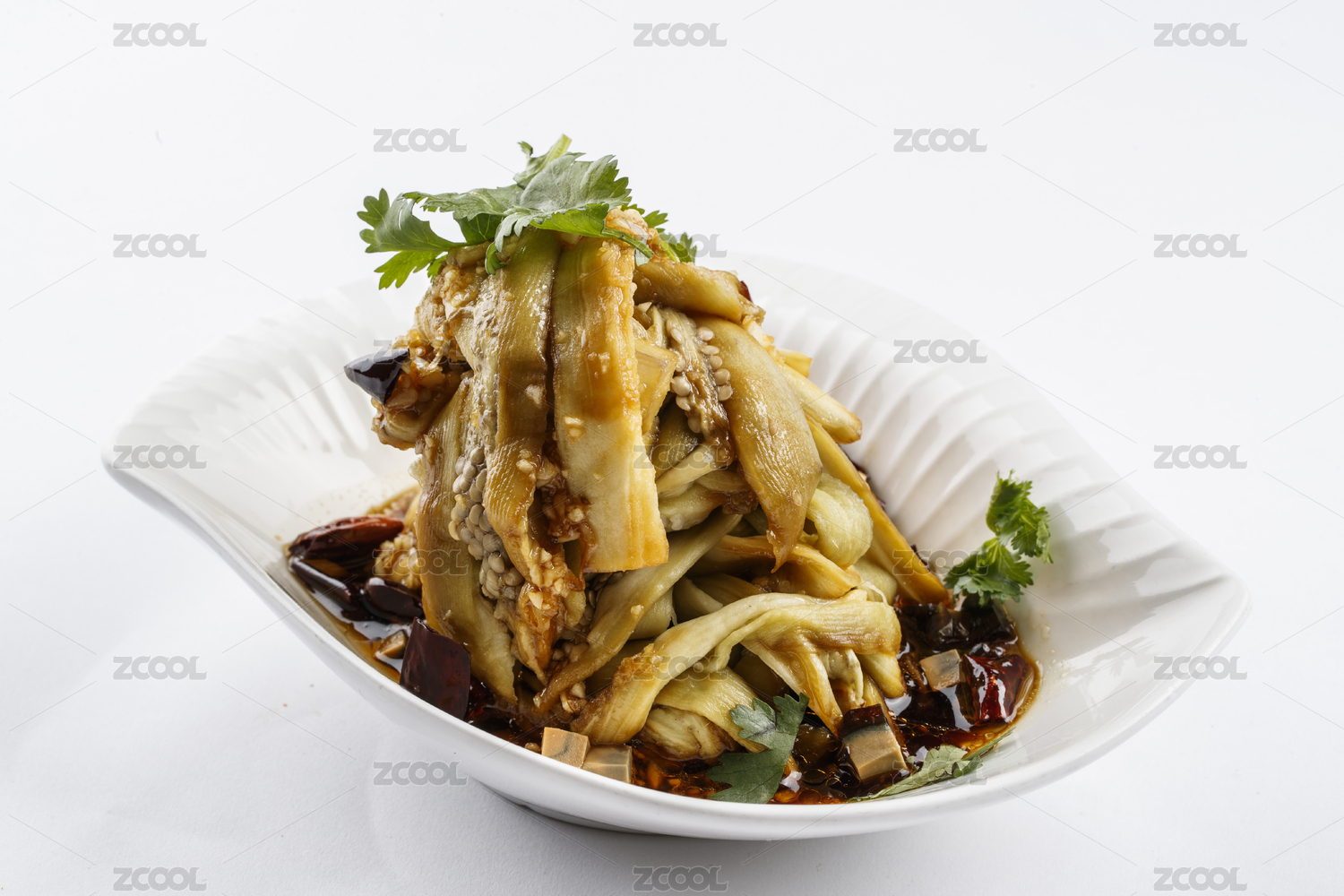 樹葉形瓷盤裝的麻油茄子
