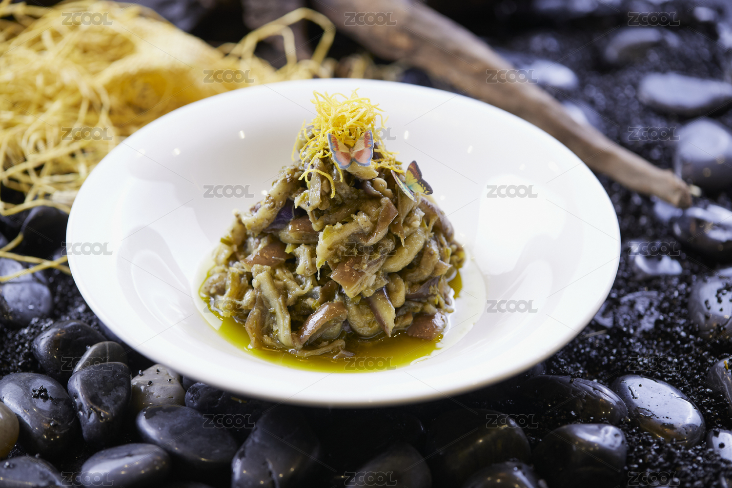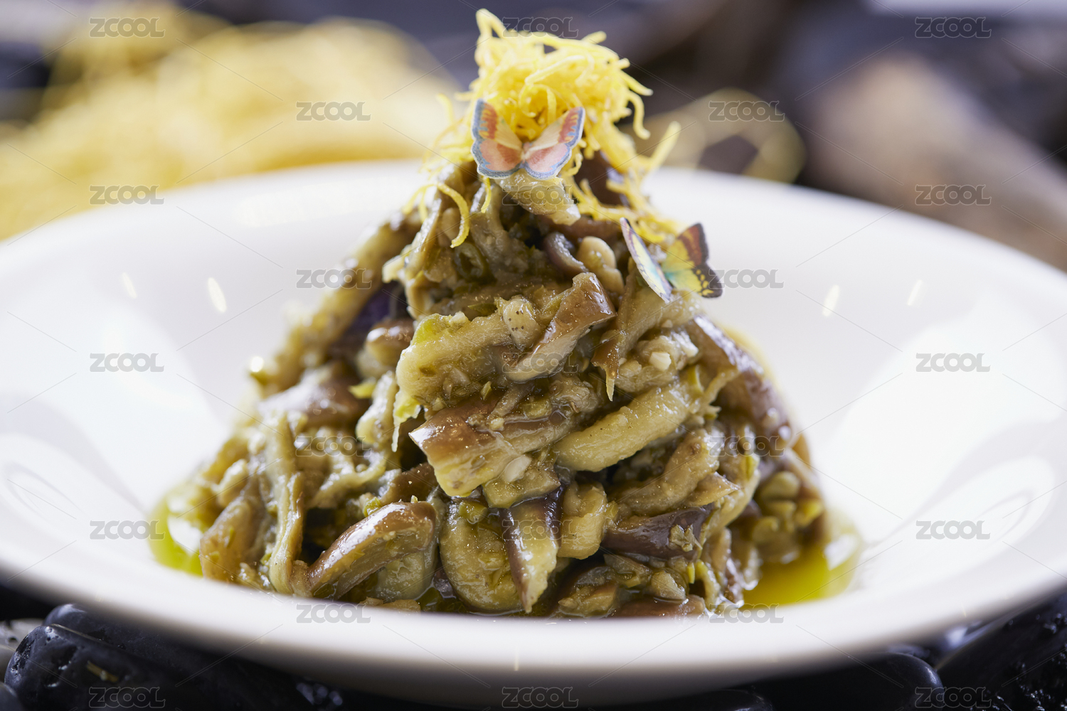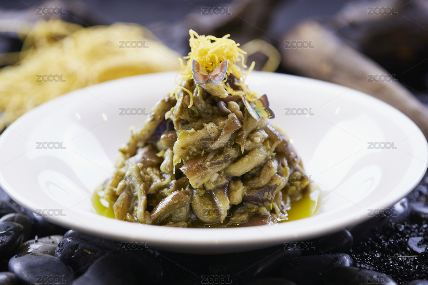 樹葉形瓷盤裝的麻油茄子