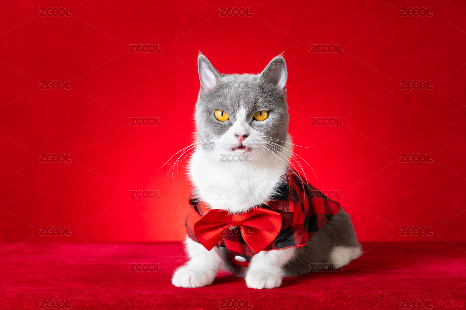 穿著格子衣服戴著蝴蝶結(jié)的萌寵英短藍(lán)白貓貓
