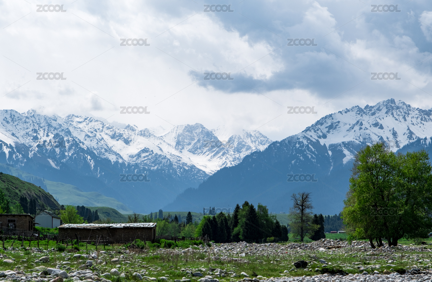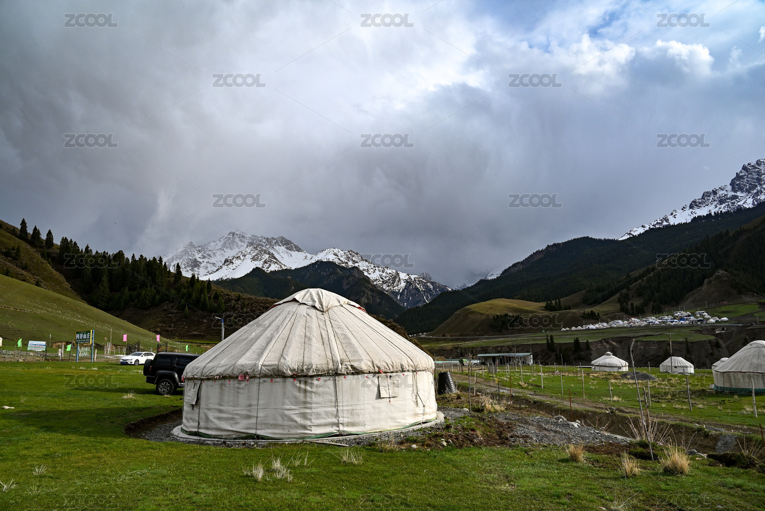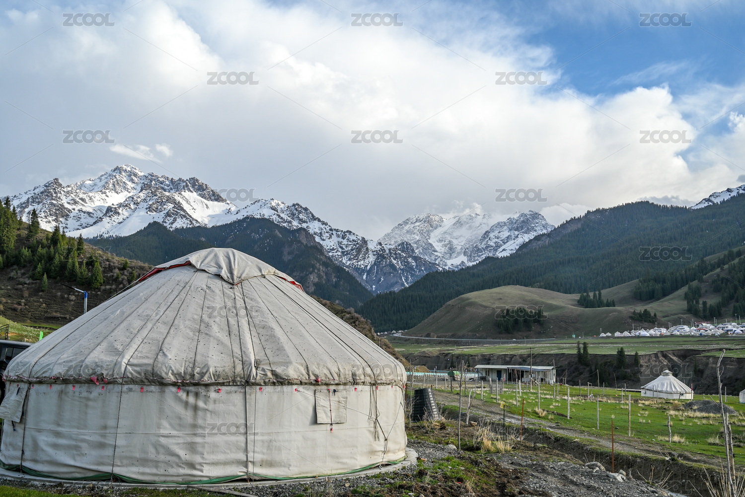中國新疆伊犁雪山下草原上的哈薩克族氈房