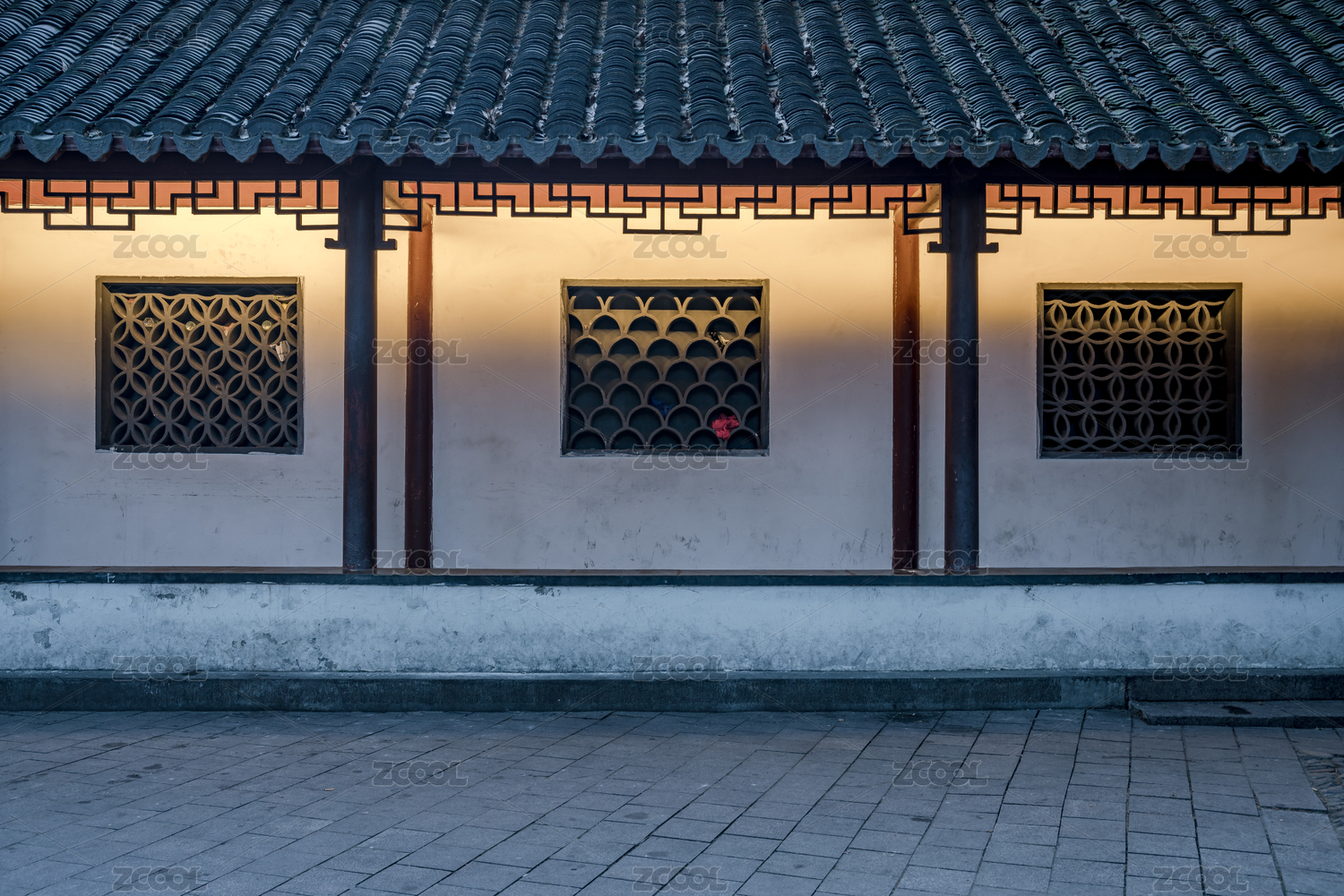 古代傳統(tǒng)中式古典建筑鏤空窗戶長廊走廊欄桿