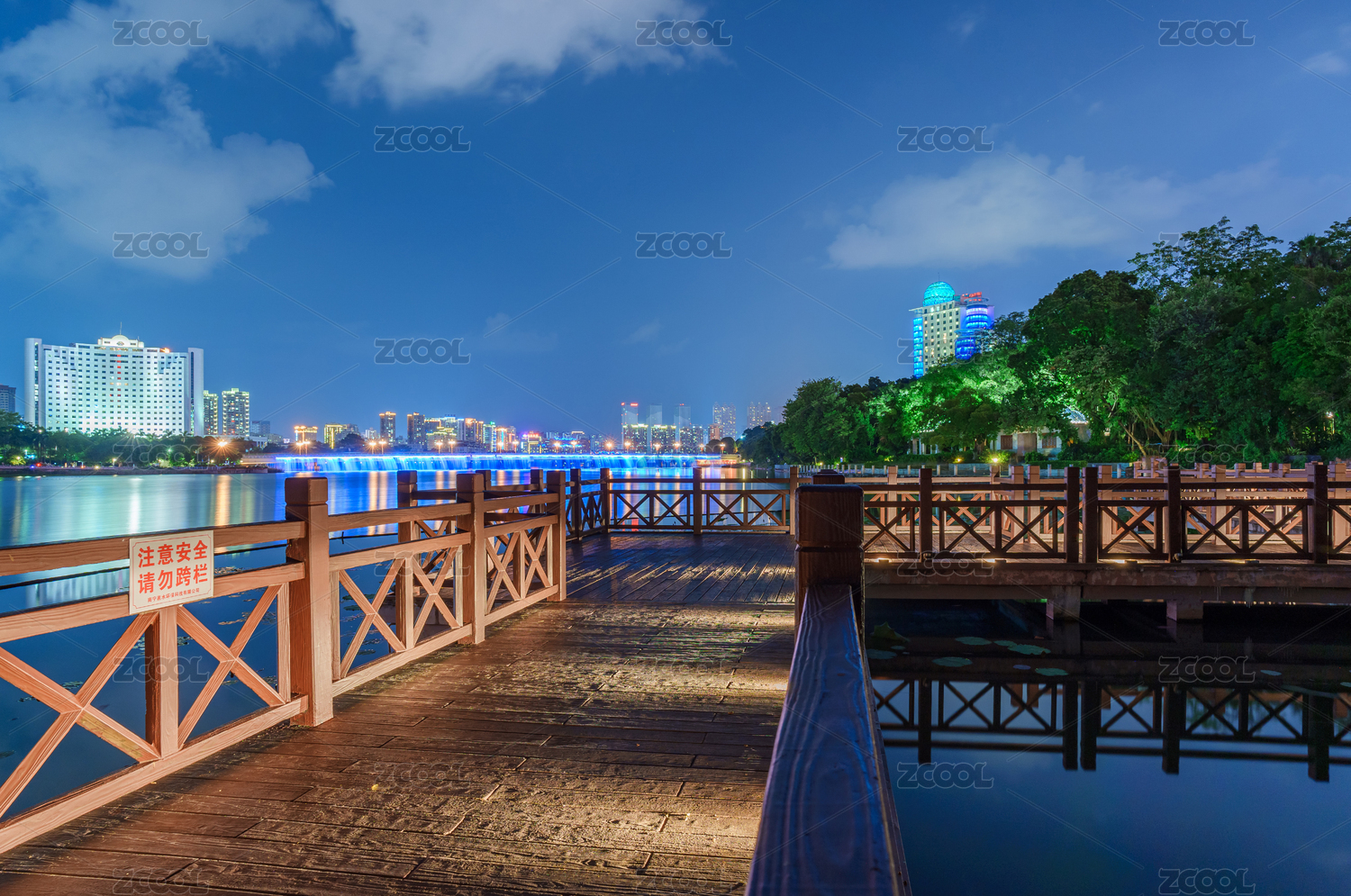 南寧南湖公園木棧道與城市摩天大樓夜景燈光