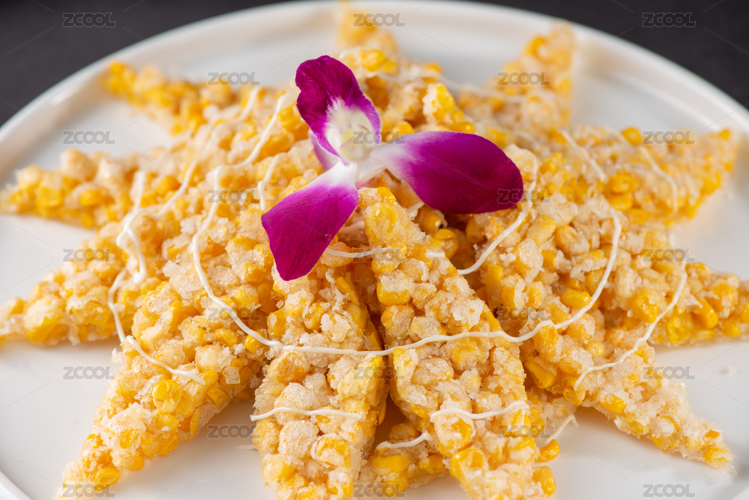 一盤香酥玉米烙和叉子上叉碰上玉米烙