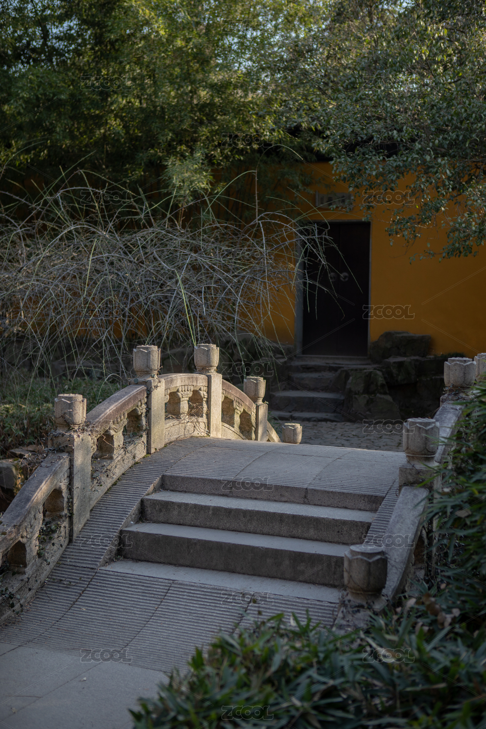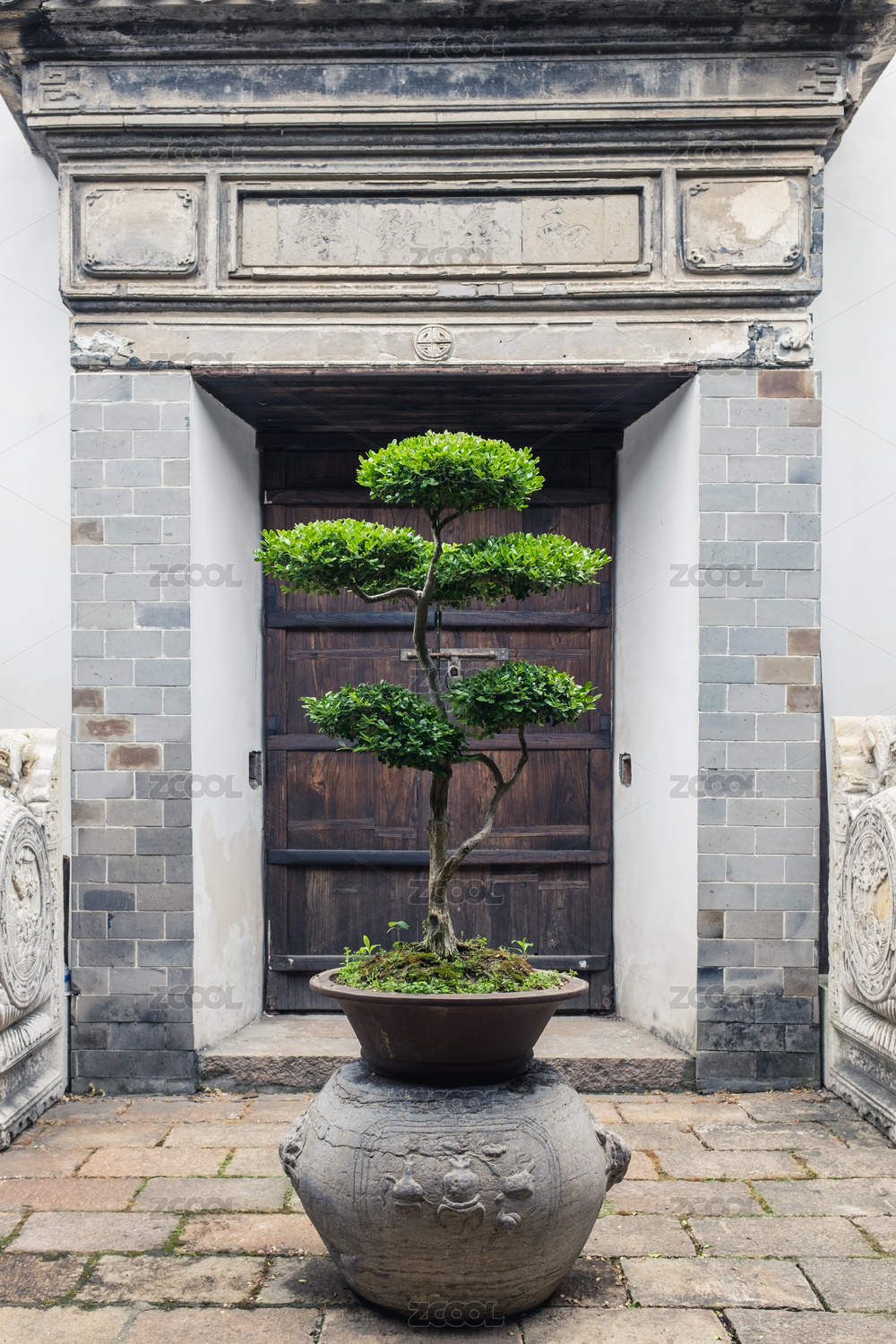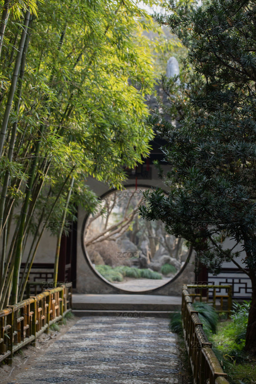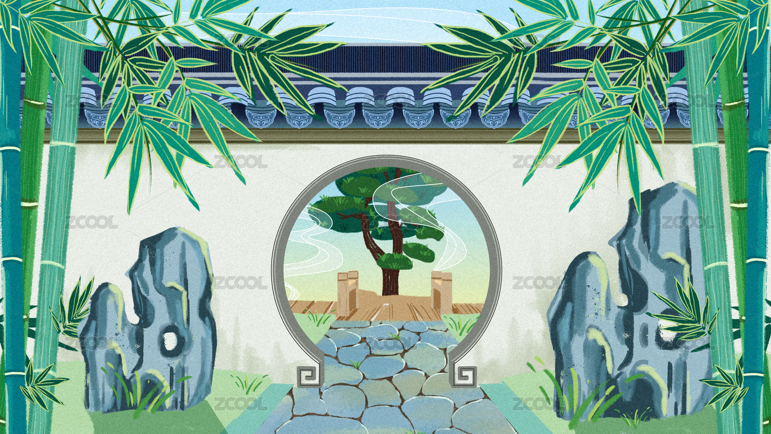 蘇式園林里拱門下的石板路兩邊種著竹子插畫