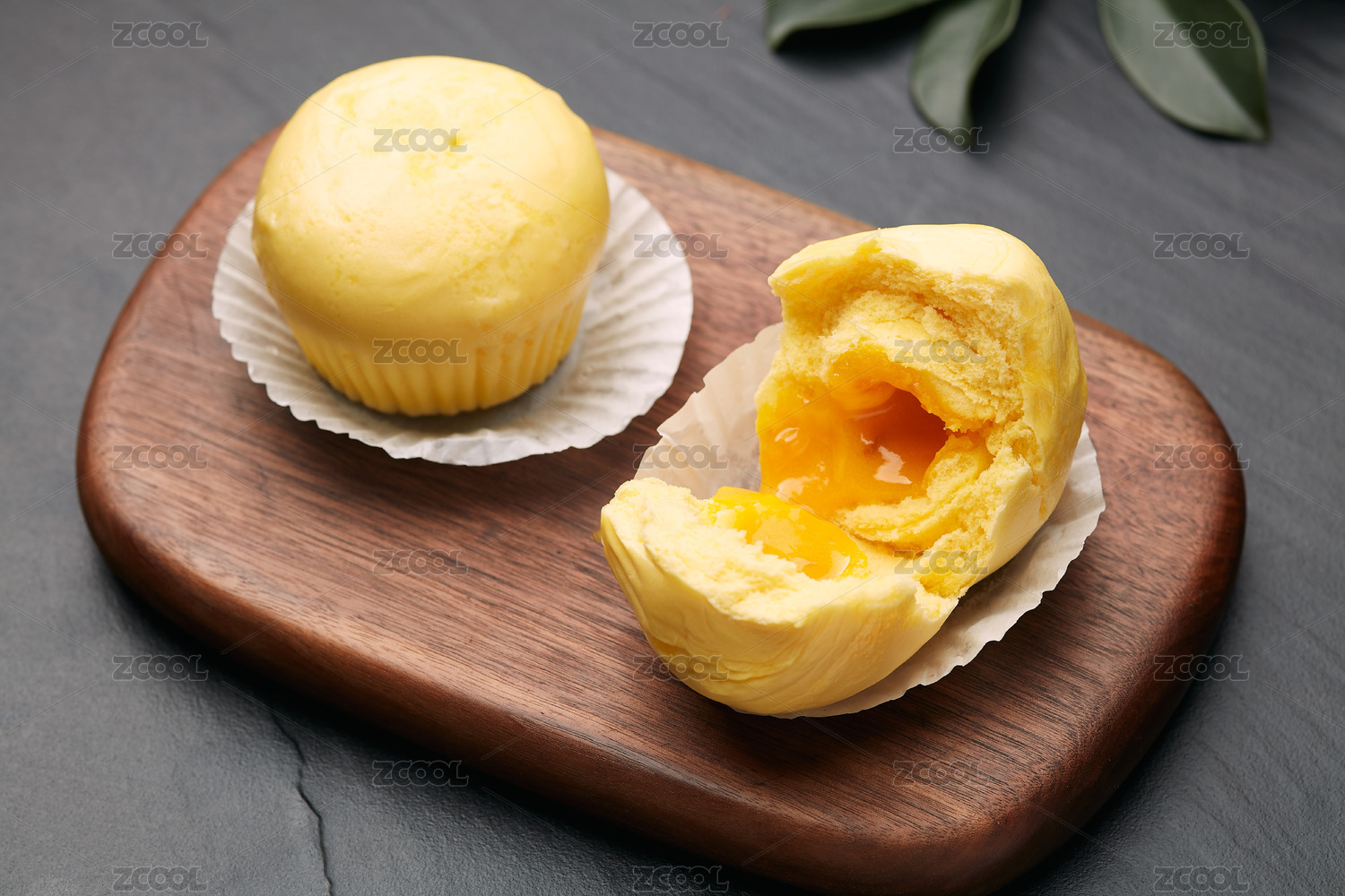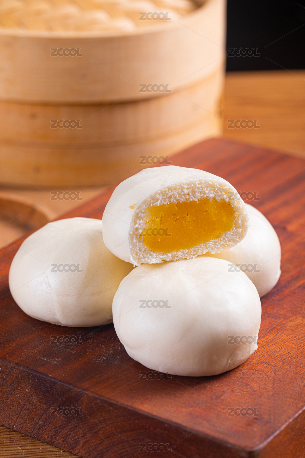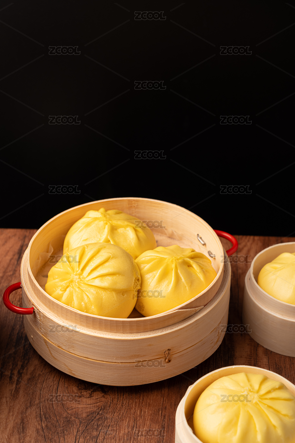 深色桌面擺放著傳統(tǒng)廣式甜點(diǎn)奶黃包