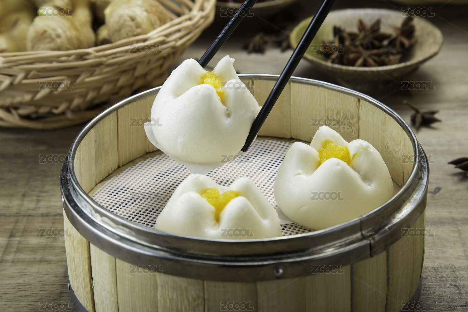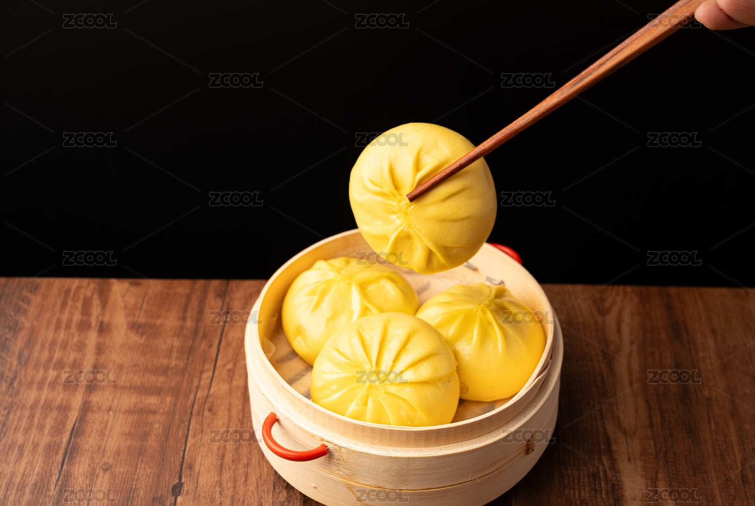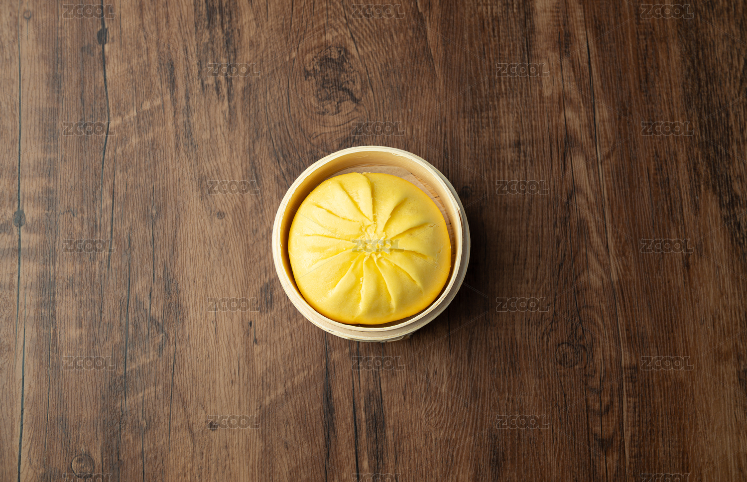 深色桌面擺放著傳統(tǒng)廣式甜點(diǎn)奶黃包