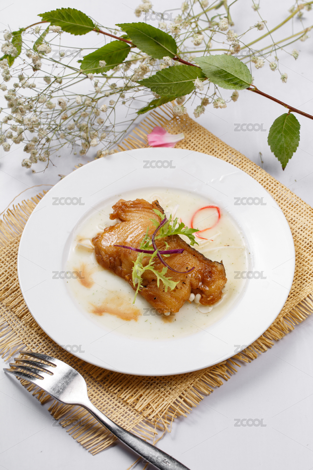 鐵板照燒汁煎銀鱈魚擺放在草墊上