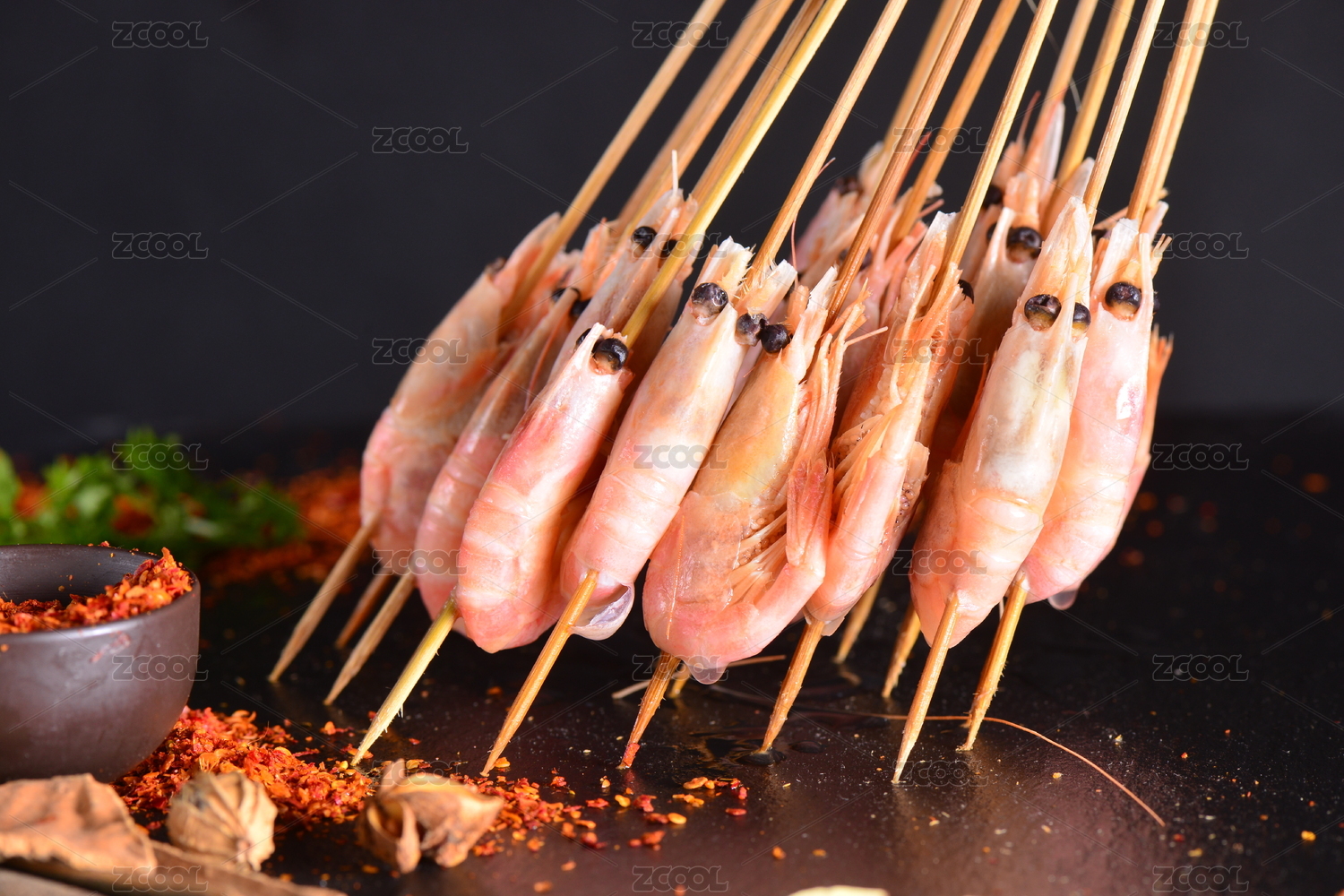 黑色背景燒烤竹簽串著的麻辣烤串串烤蝦