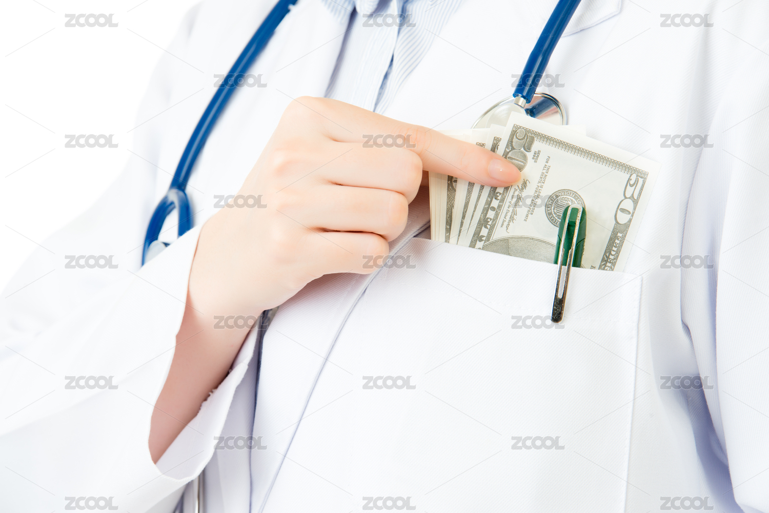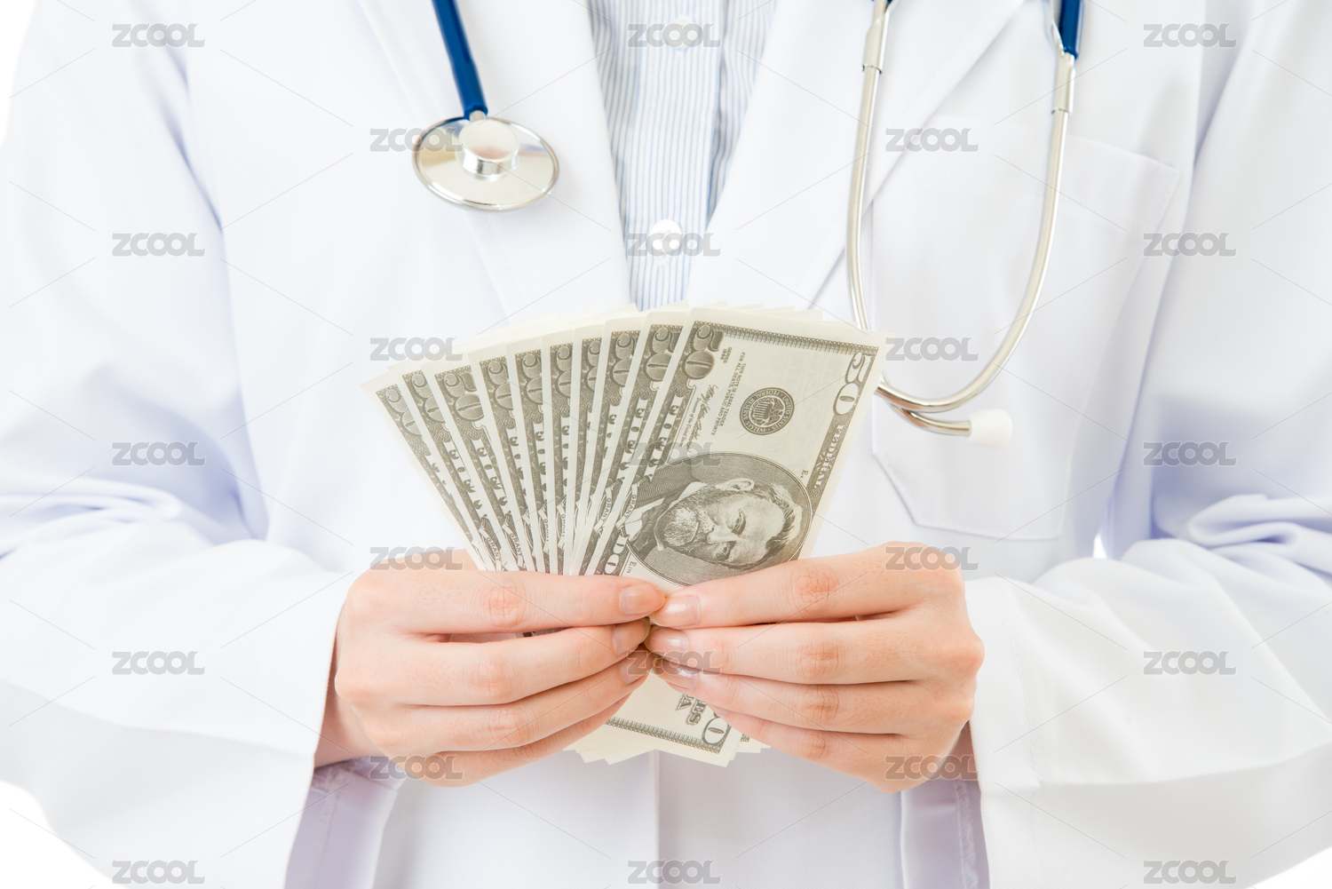 亞洲女醫(yī)生拿錢賄賂收入。隔絕在白色背景。醫(yī)療和健康理念
