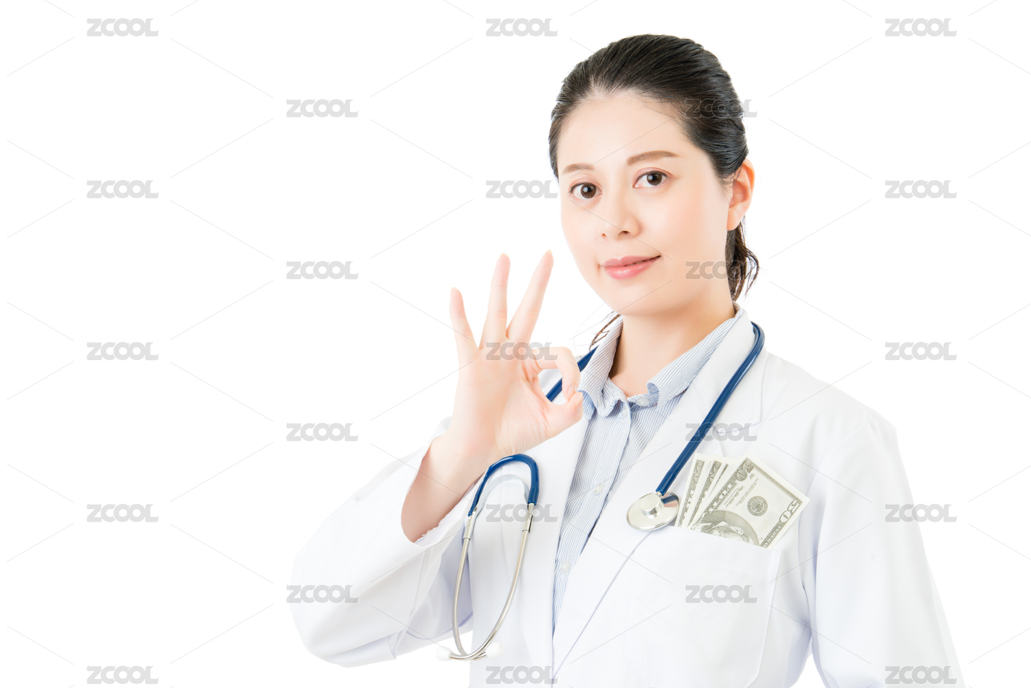 亞洲女醫(yī)生拿錢賄賂OK手勢(shì)。隔絕在白色背景。醫(yī)療和健康理念