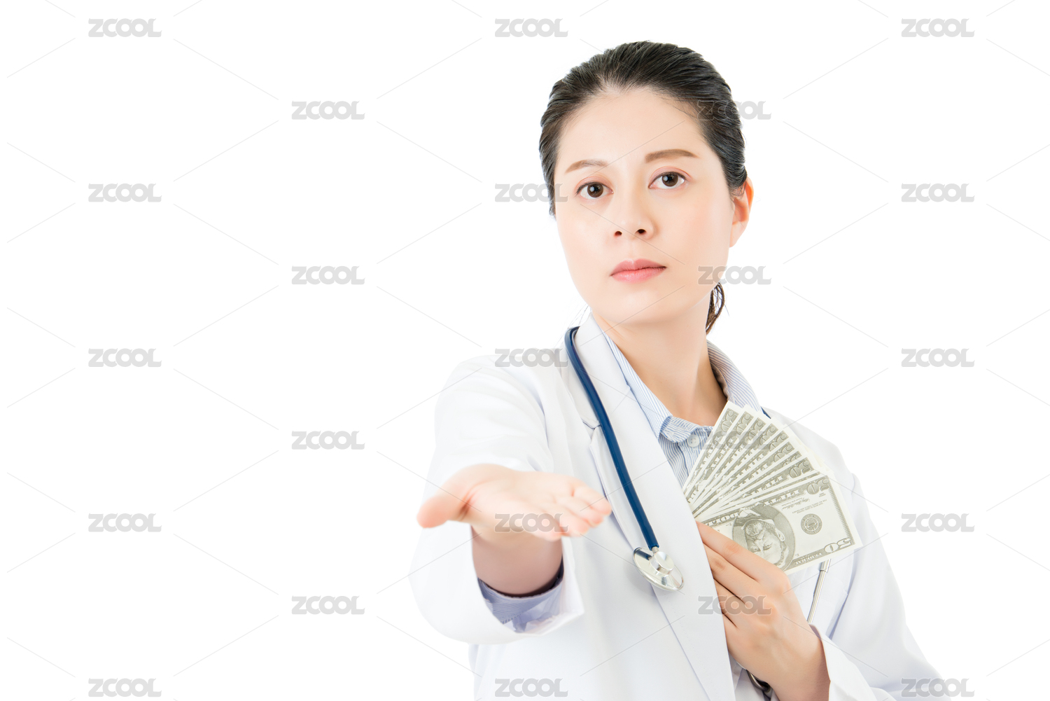 亞洲女醫(yī)生問錢賄賂收入。隔絕在白色背景。醫(yī)療和健康理念