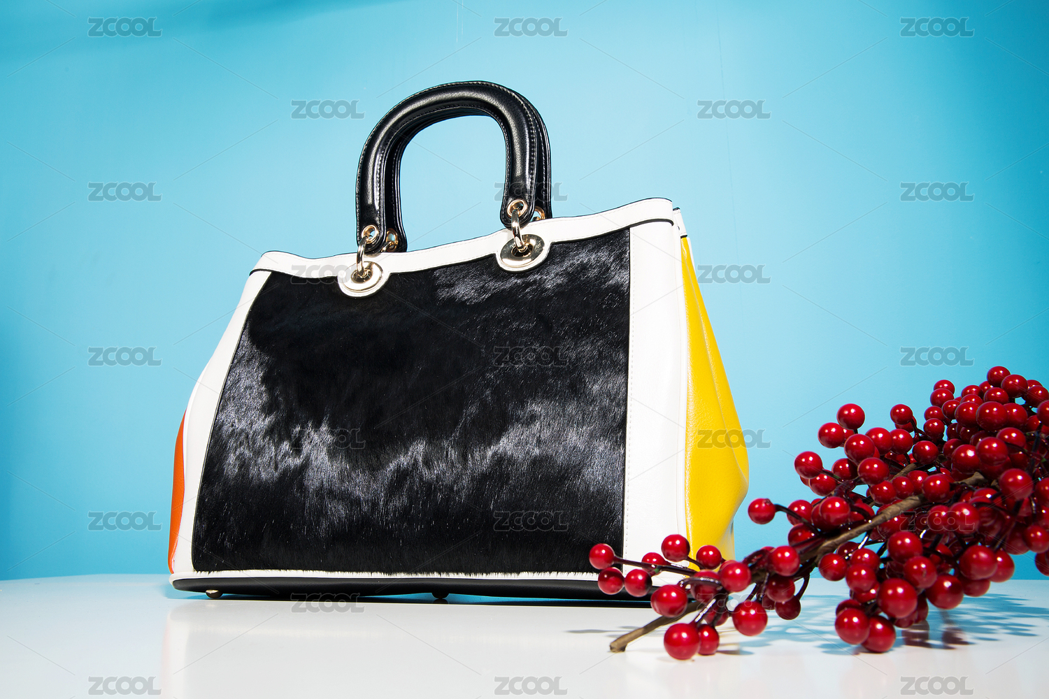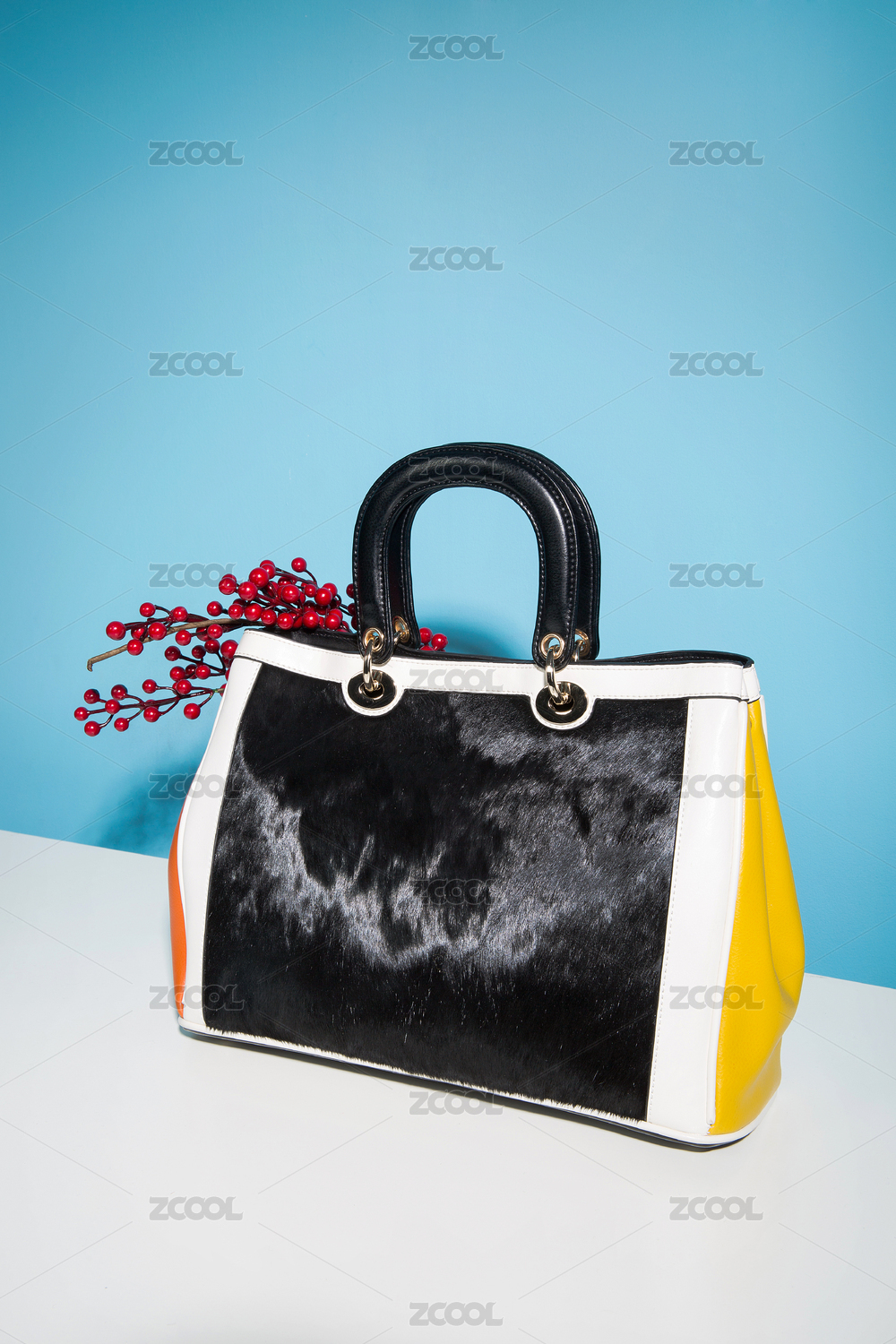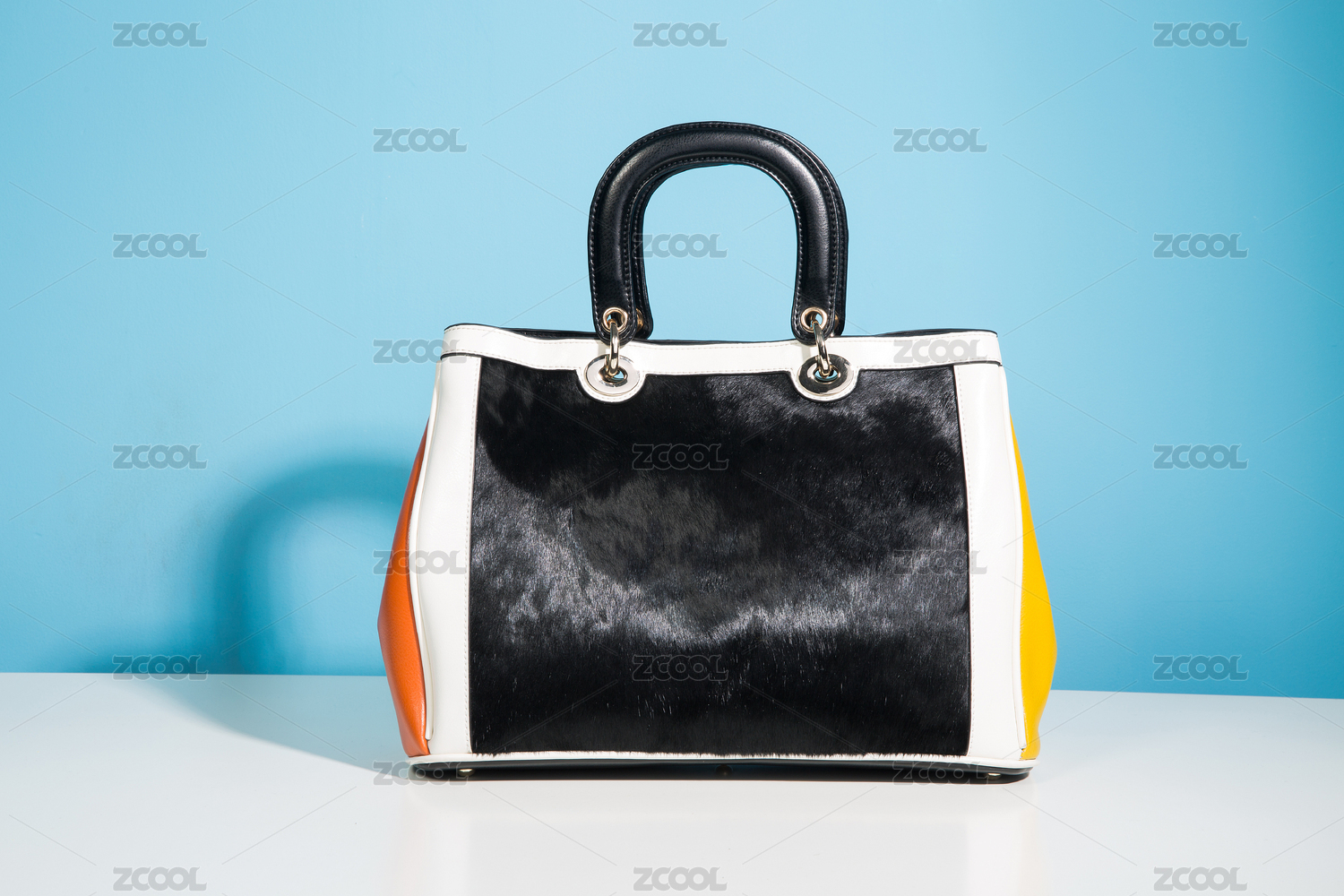 藍(lán)色背景白桌子上的手提包