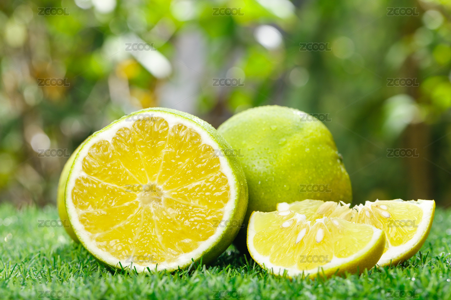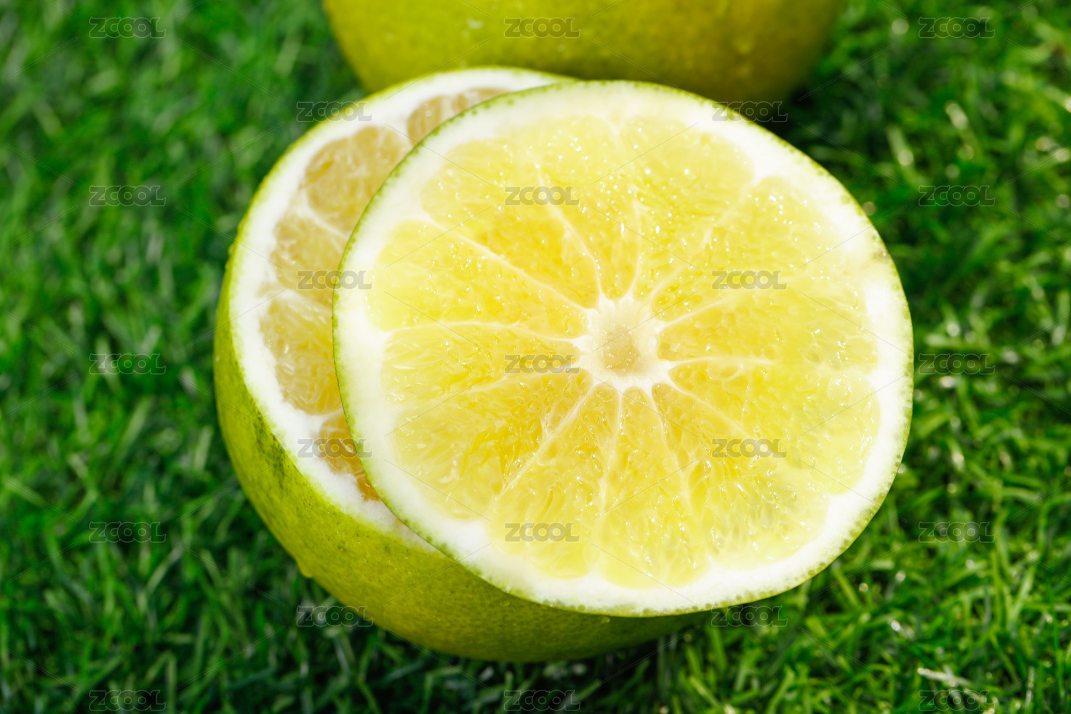 綠色草坪上放著葡萄柚和切面的雞尾葡萄柚