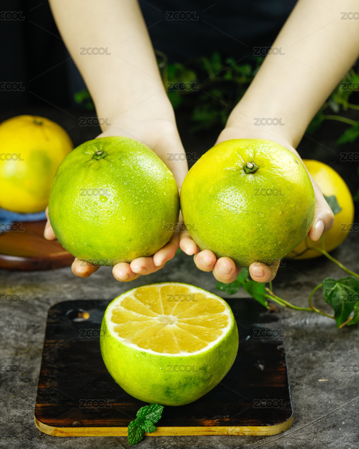 手上放著兩個完整的雞尾青柚和半邊切面柚子