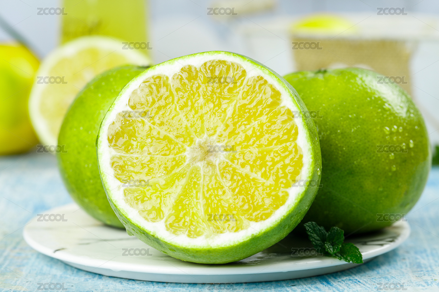 深底上放著一藍雞尾青柚和半邊切面青柚