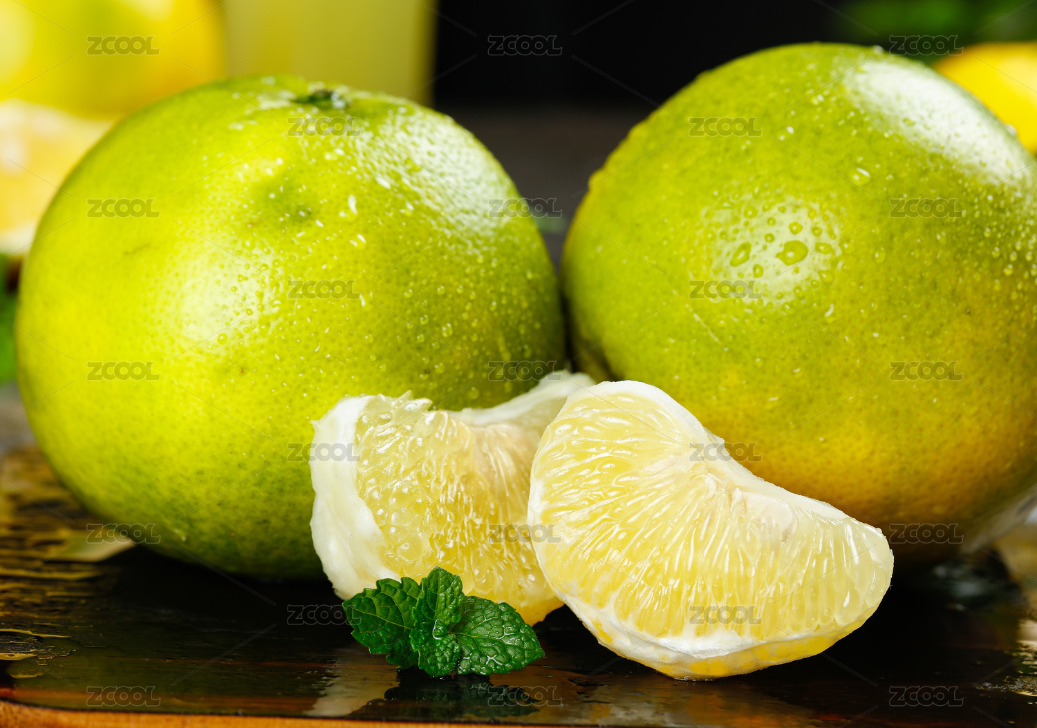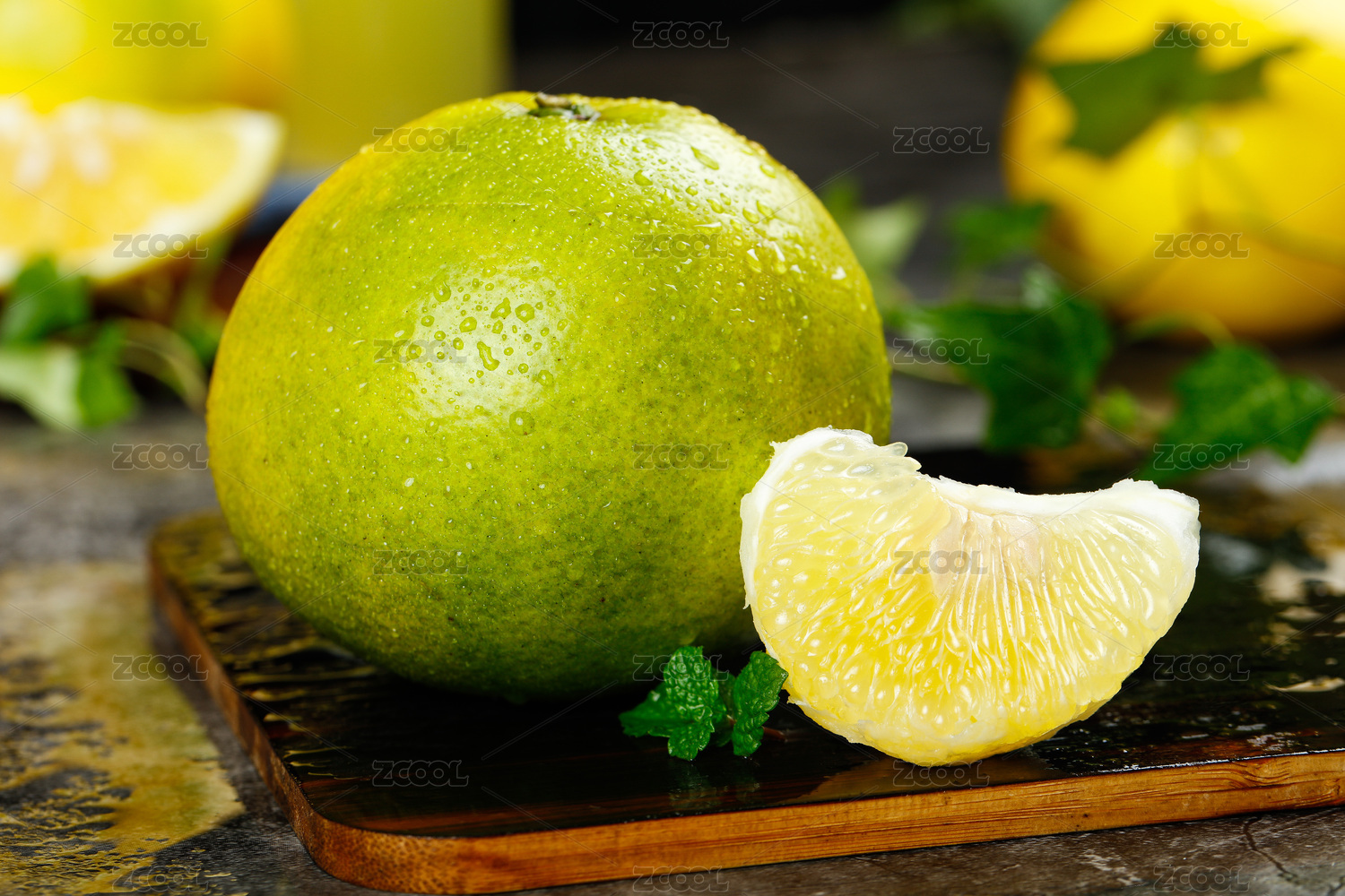一堆青媛柚和半邊切面的蜜柚