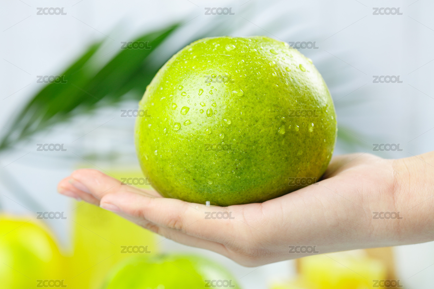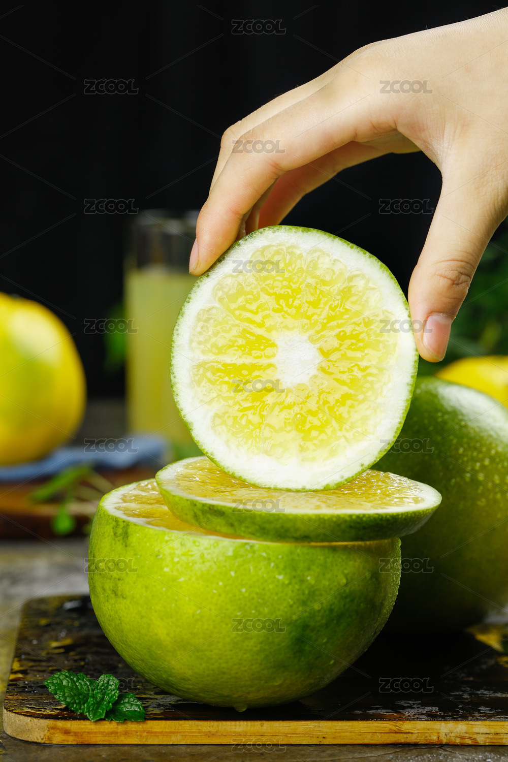 淺藍底上盤子里放著青柚和手上拿著半邊西柚