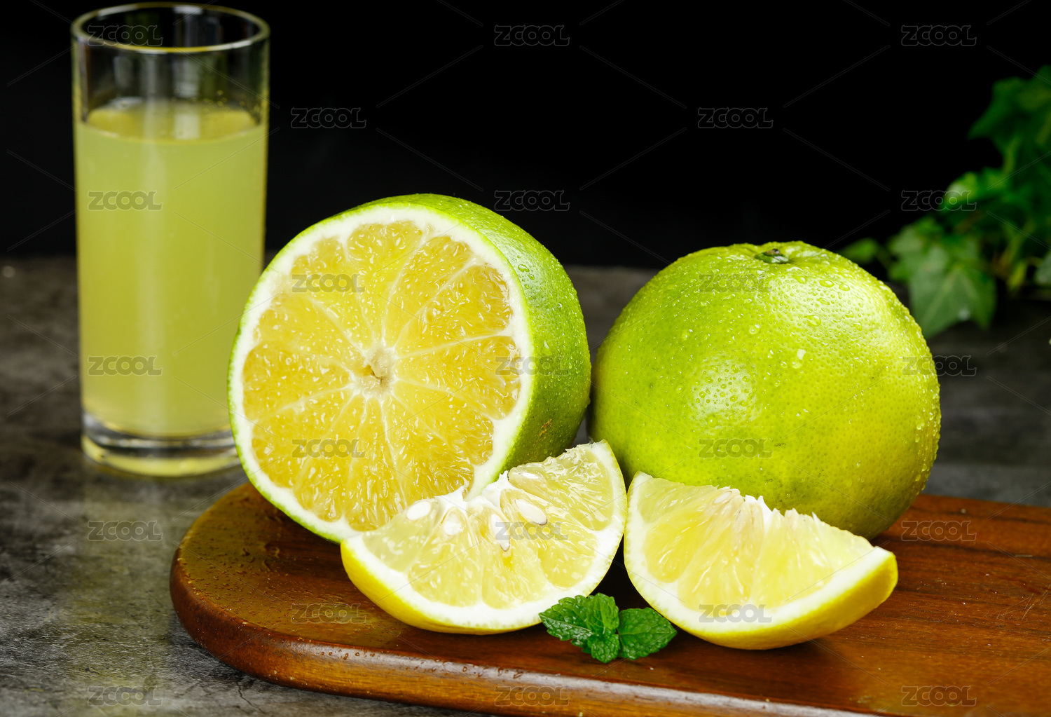 深底上放著一杯葡萄柚果汁和筐子里放著青柚