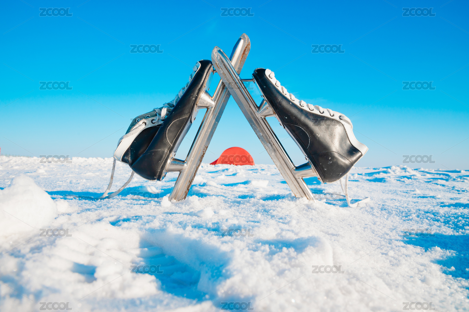 雪地上的一雙溜冰鞋和一只紅色的帳篷