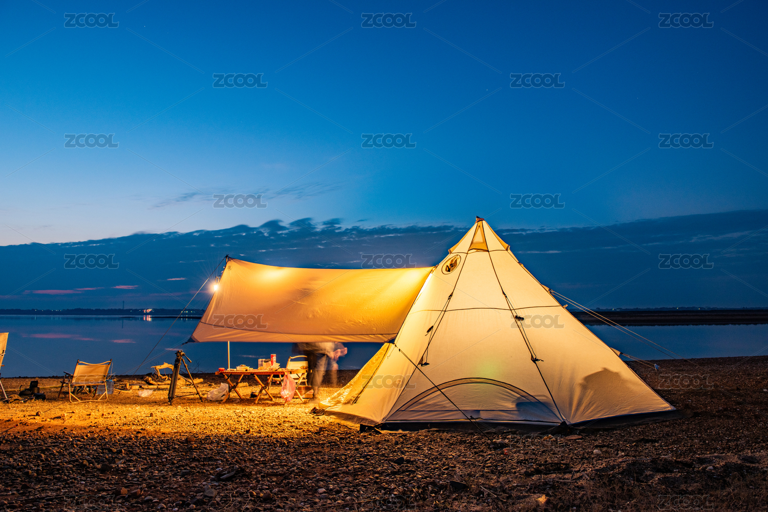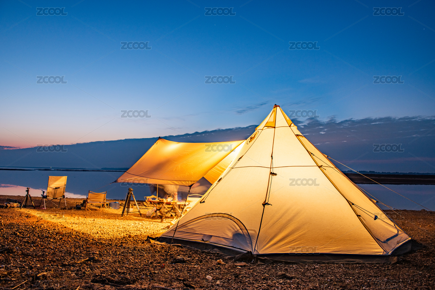 傍晚湖邊露營(yíng)的帳篷和天幕