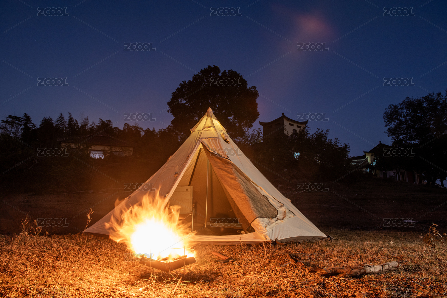 晚上露營(yíng)的金字塔帳篷、篝火