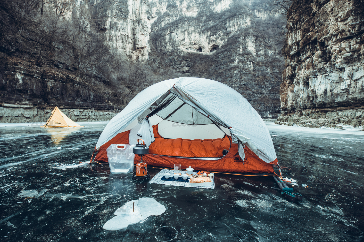 冬季冰面上的帳篷和睡袋