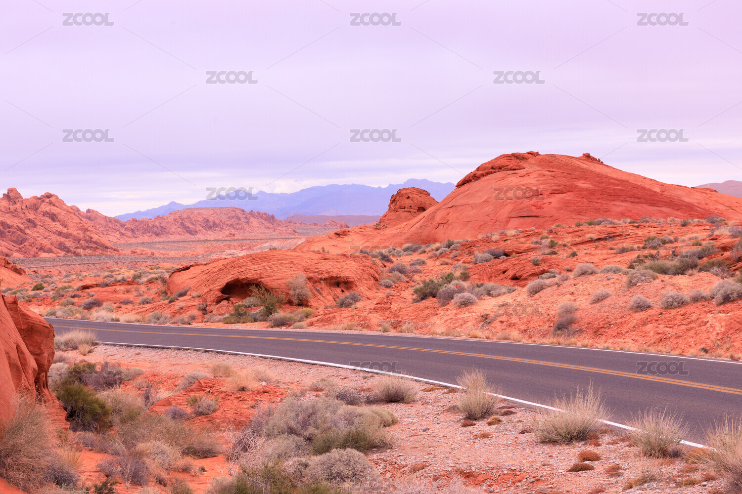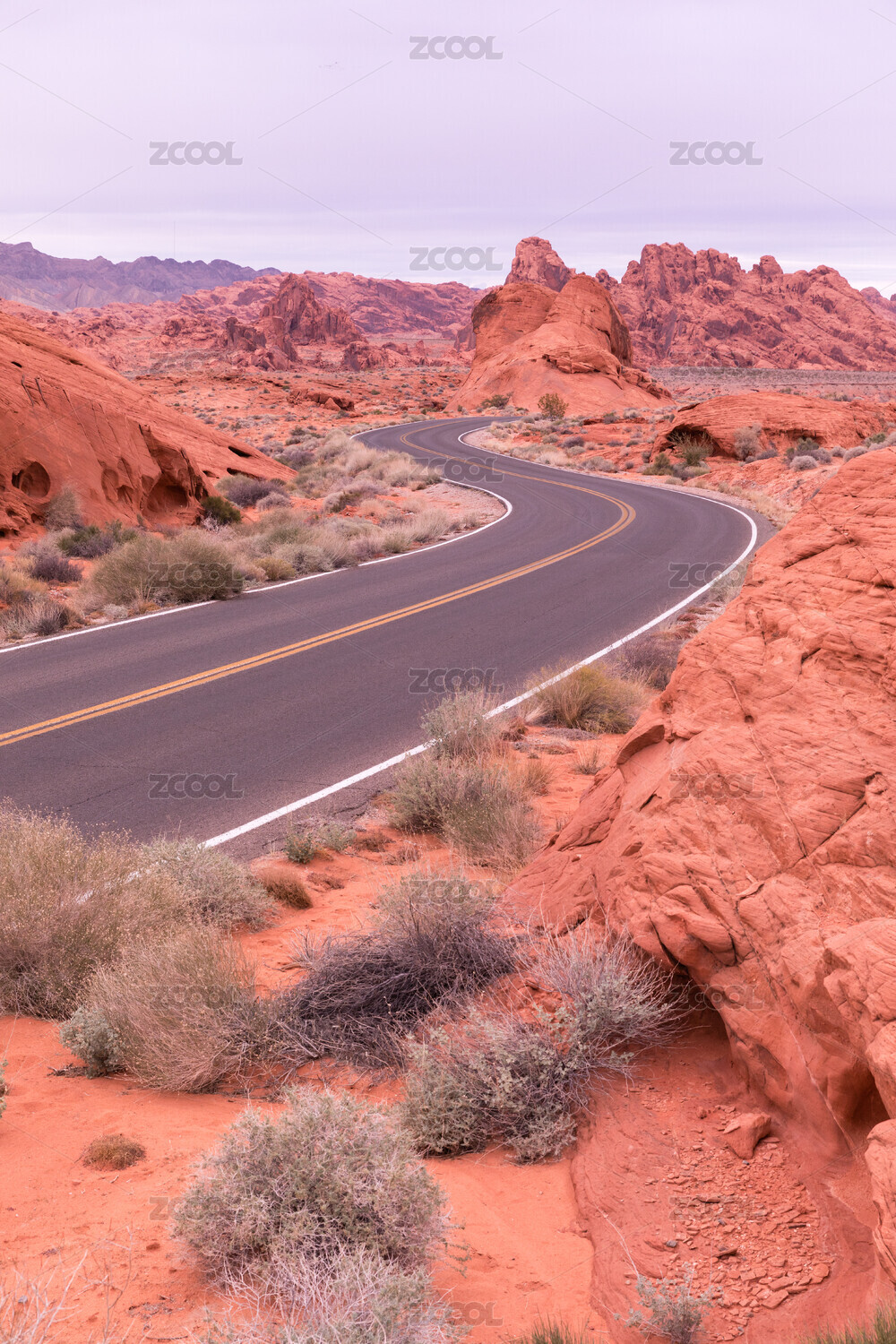 美國(guó)內(nèi)華達(dá)州火焰谷國(guó)家公園的公路繞過(guò)紅沙漠