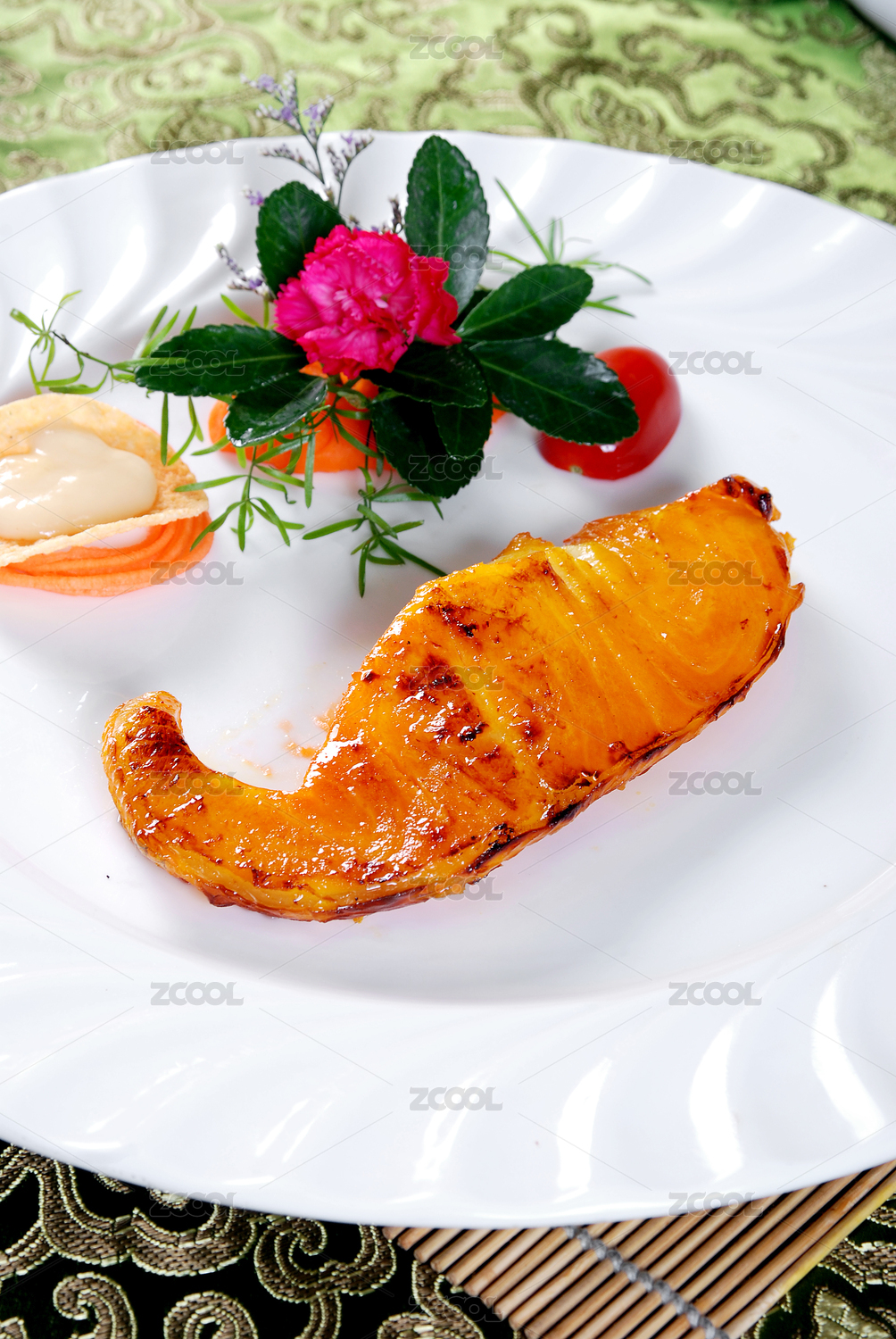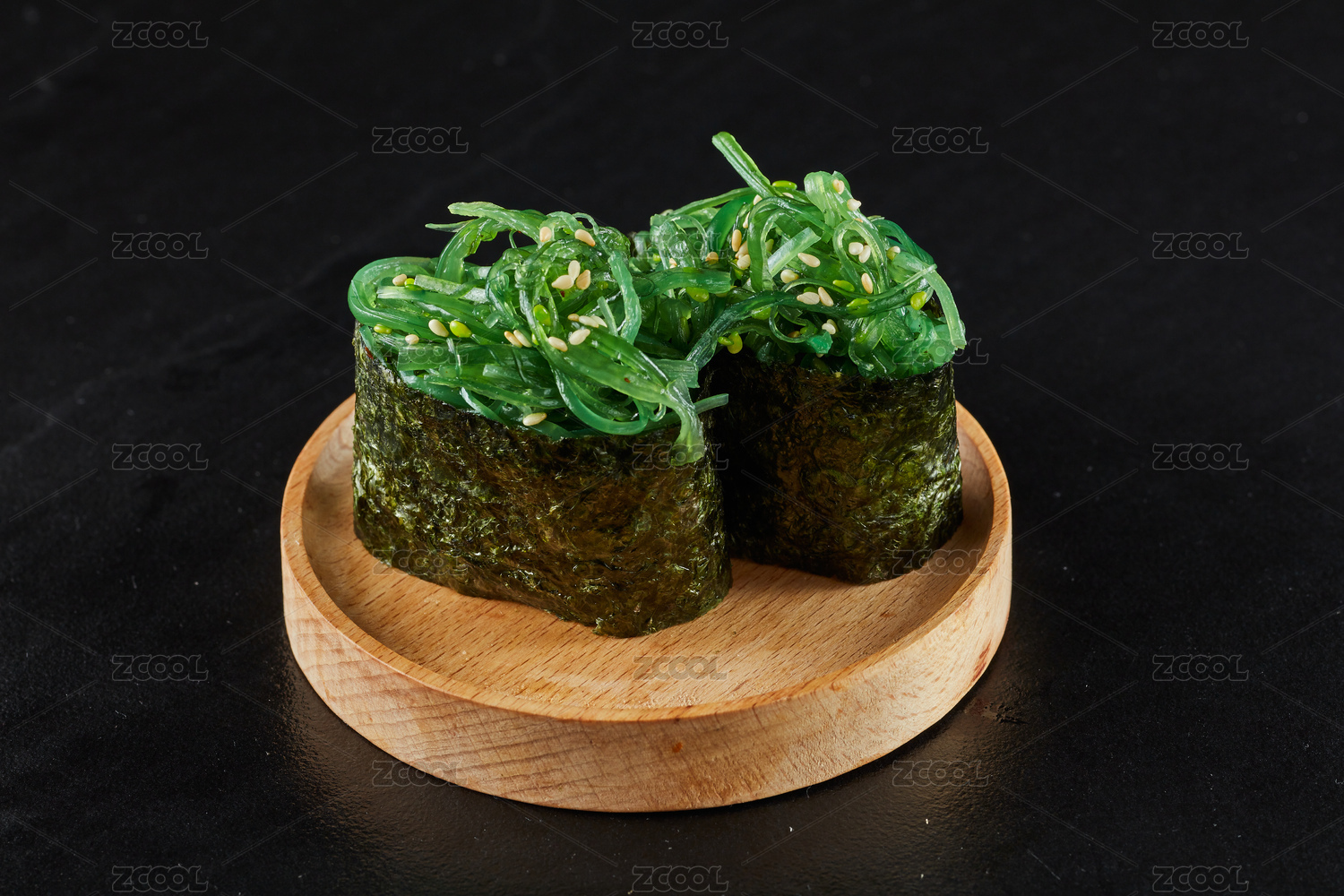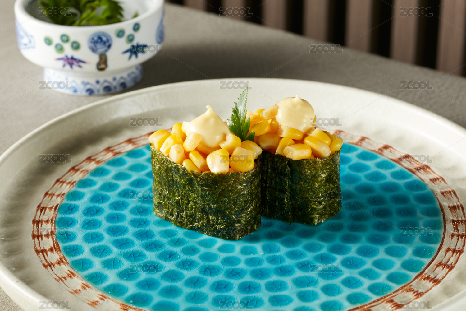 鵝頸瓷盤裝的蟹子軍艦手握壽司擺放在石頭上