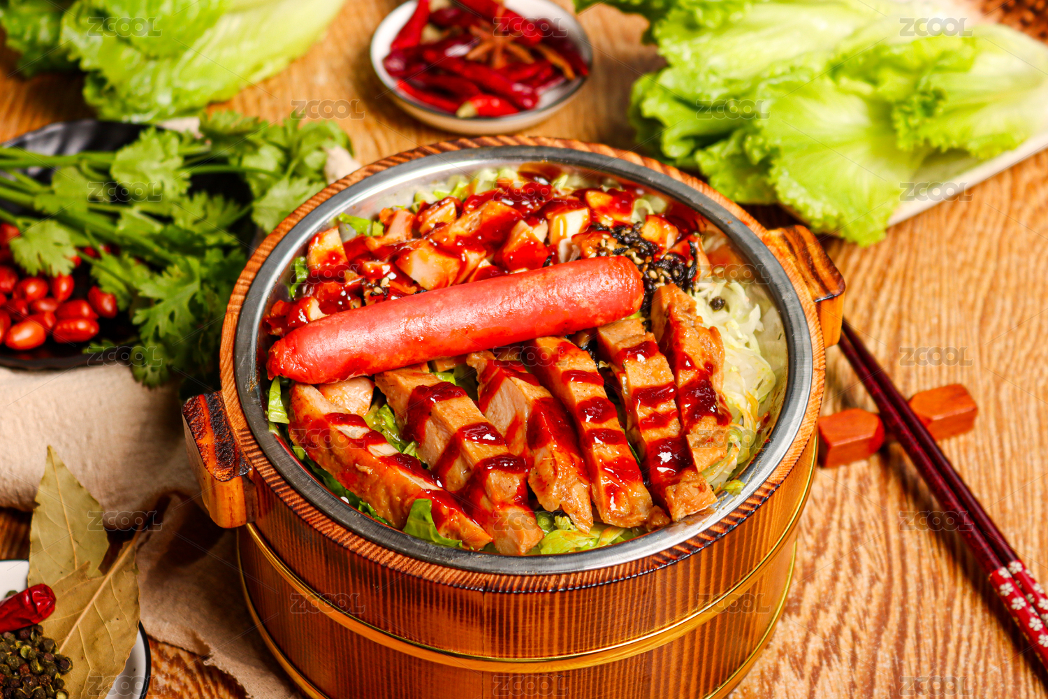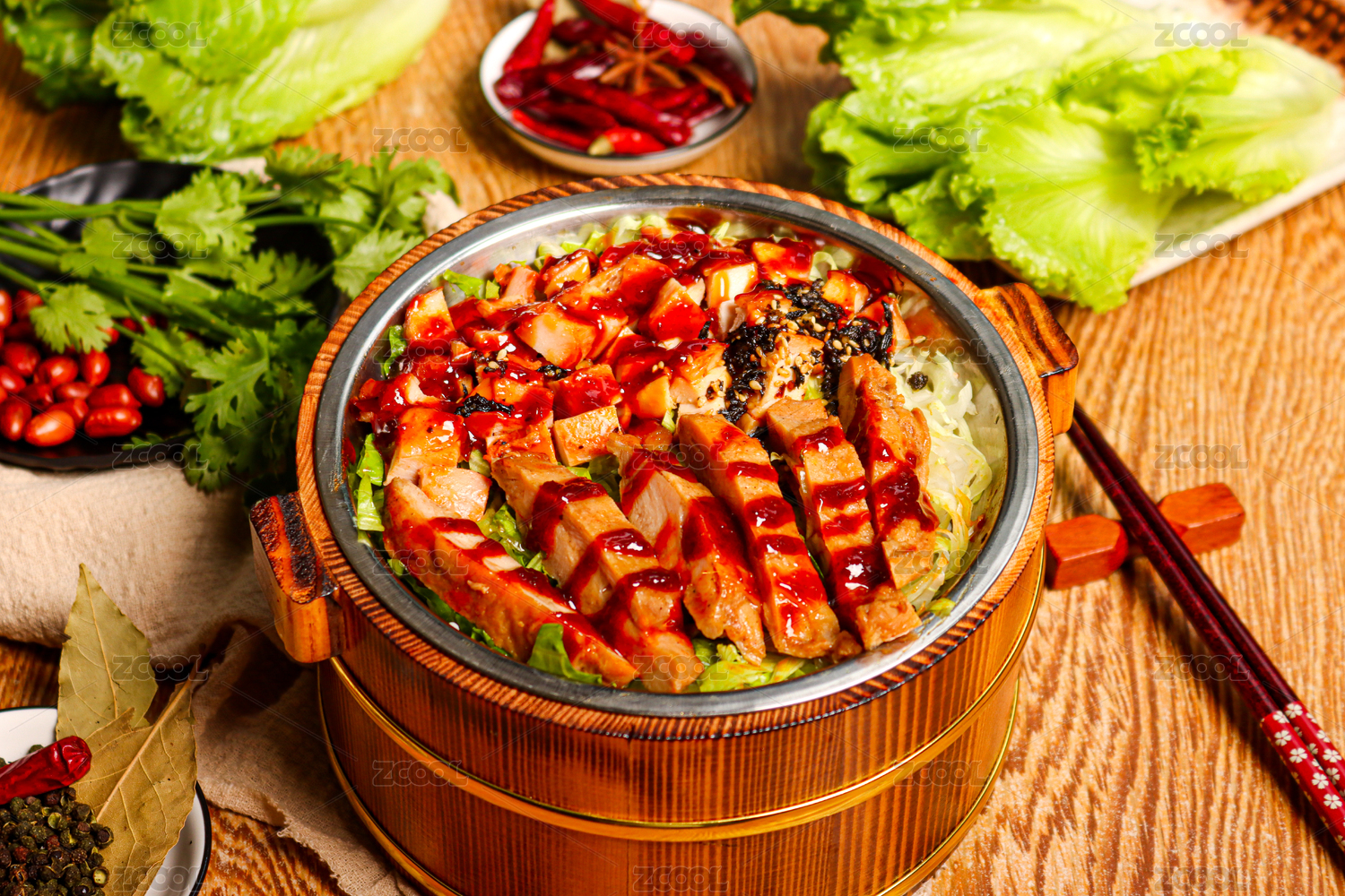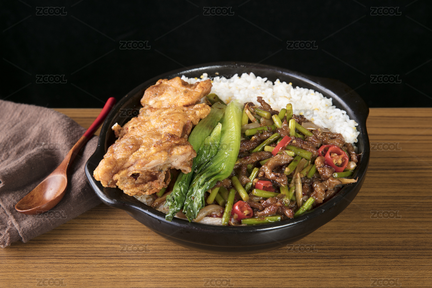 黑色砂鍋里的雞排苔蒜炒牛肉絲套飯