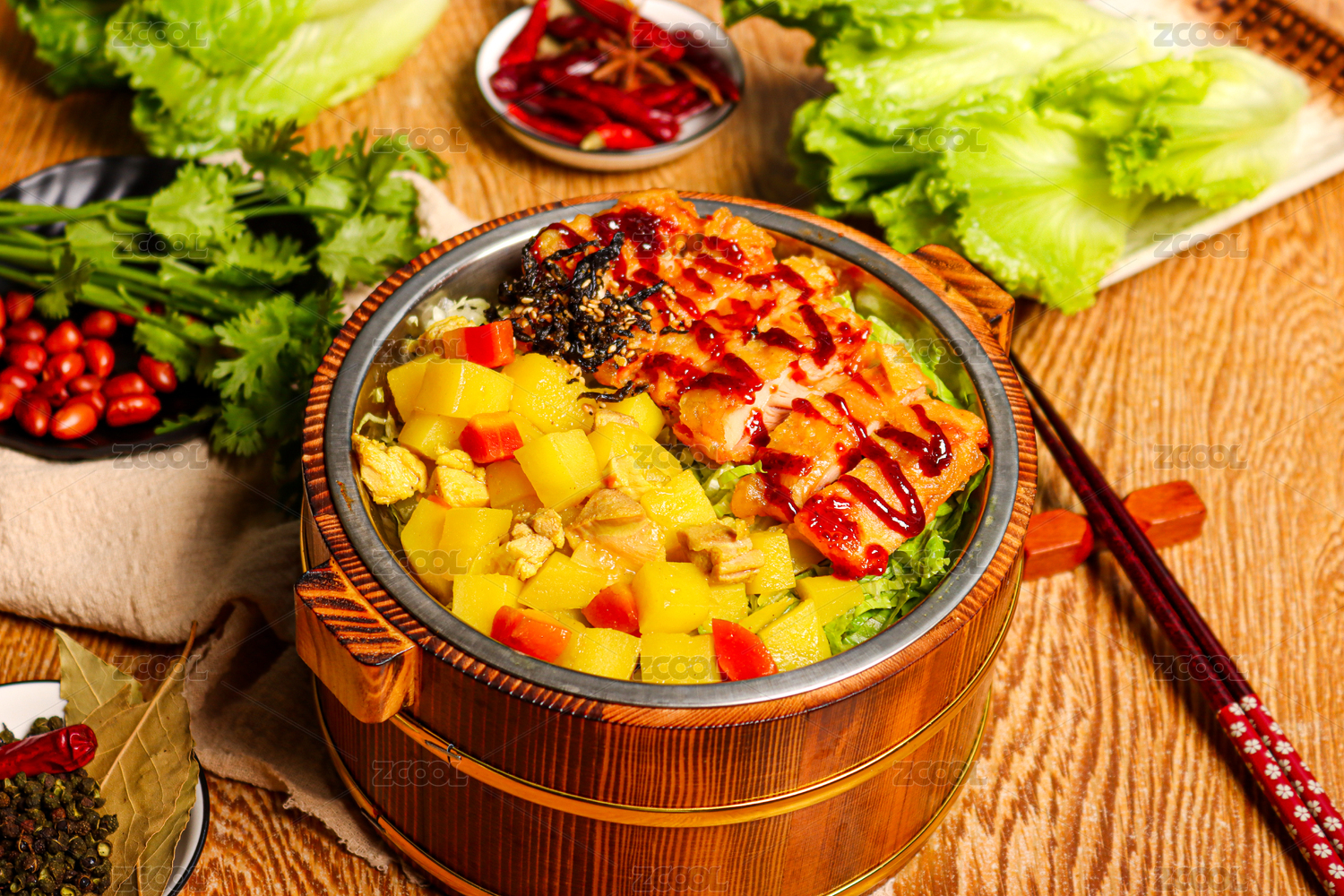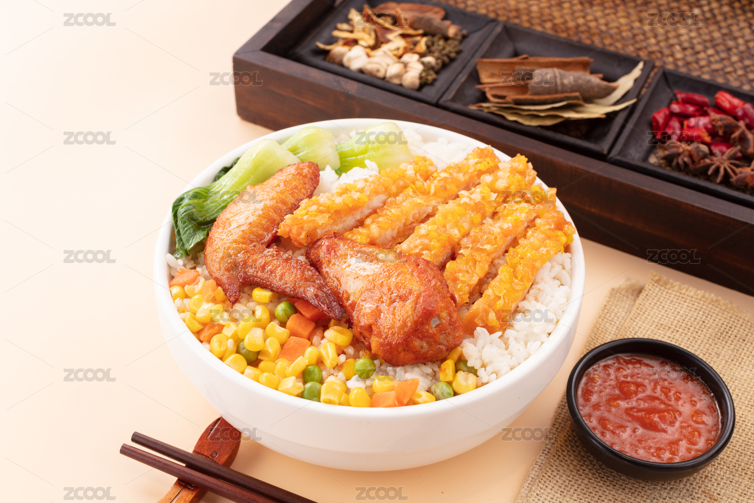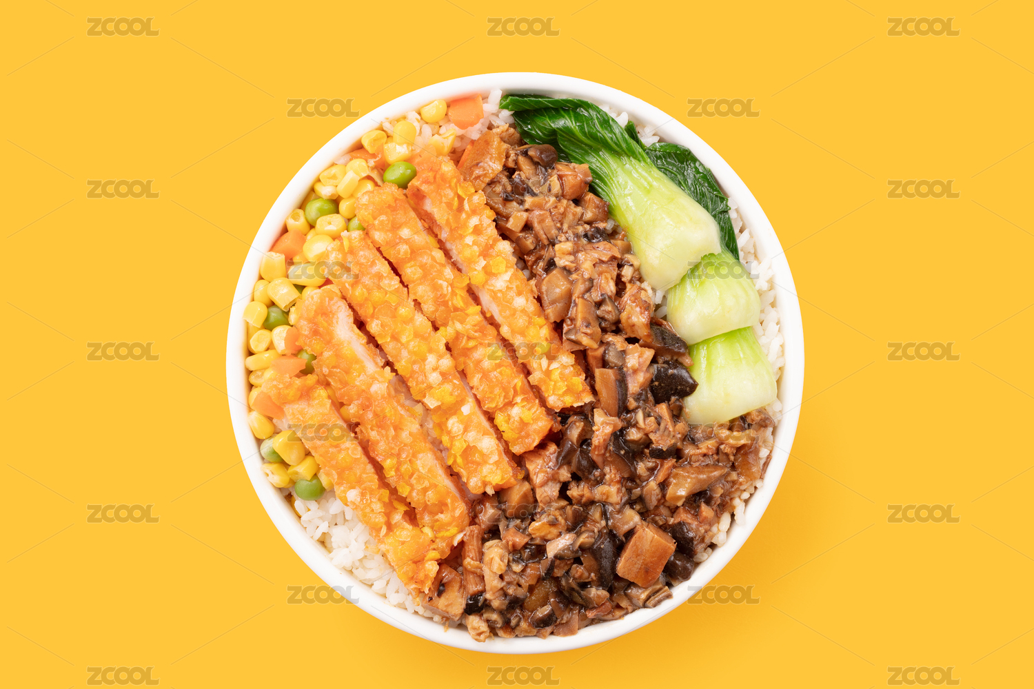 白色碗里的炸雞排彩色玉米套飯