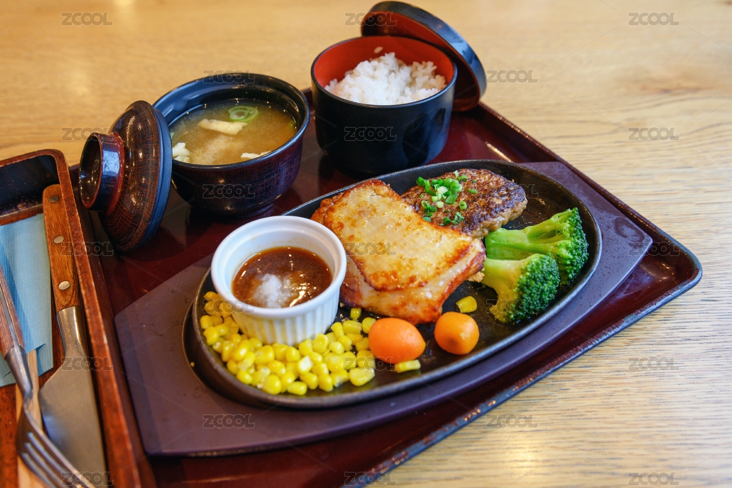 日式簡餐香煎雞排配蔬菜及米飯味增湯