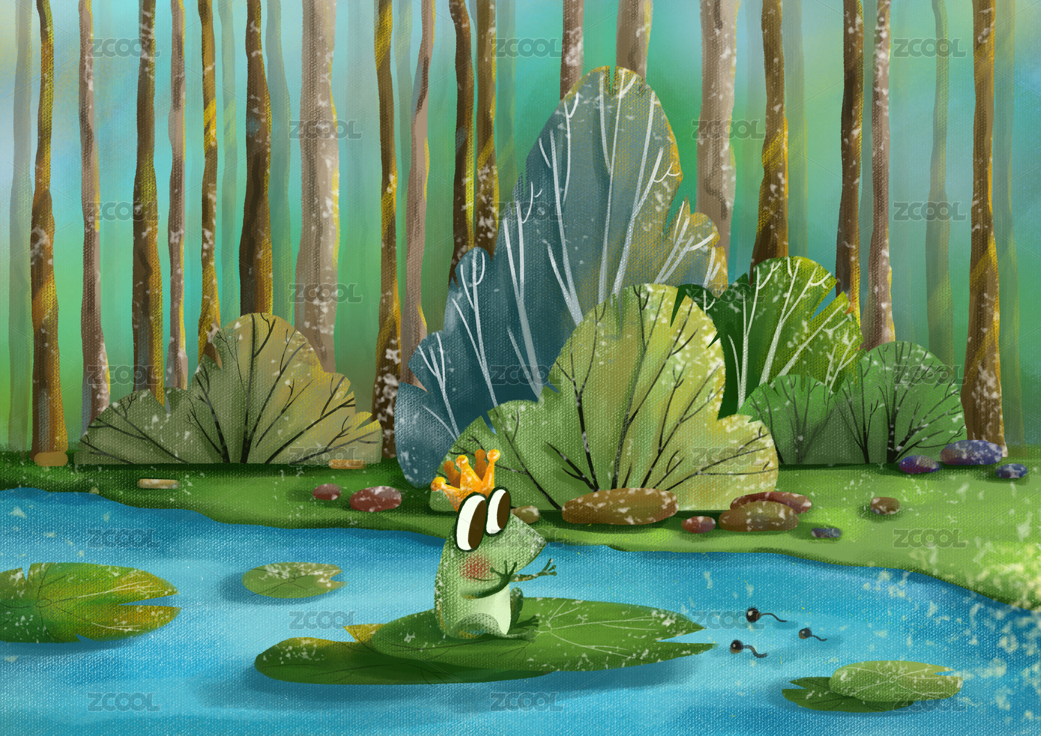 森林旁的小溪里坐在荷葉上的青蛙王子和蝌蚪打招呼