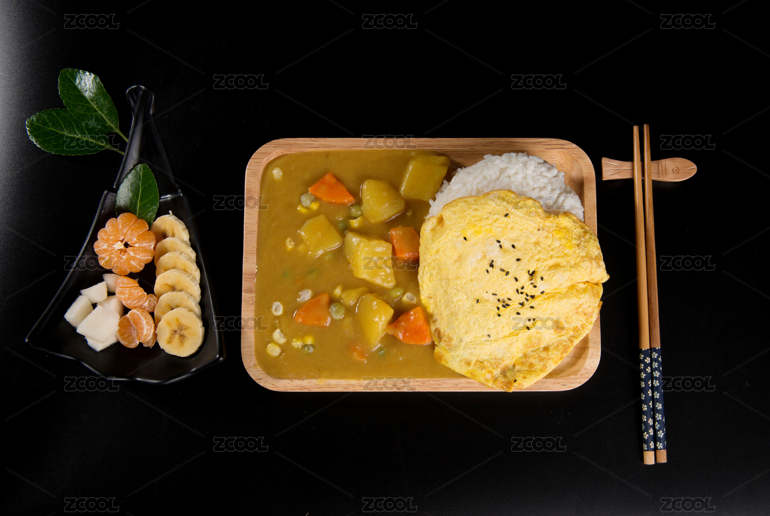 暗色木紋卓上放著一份咖喱土豆與炸豬排日料米飯?zhí)撞?/div>