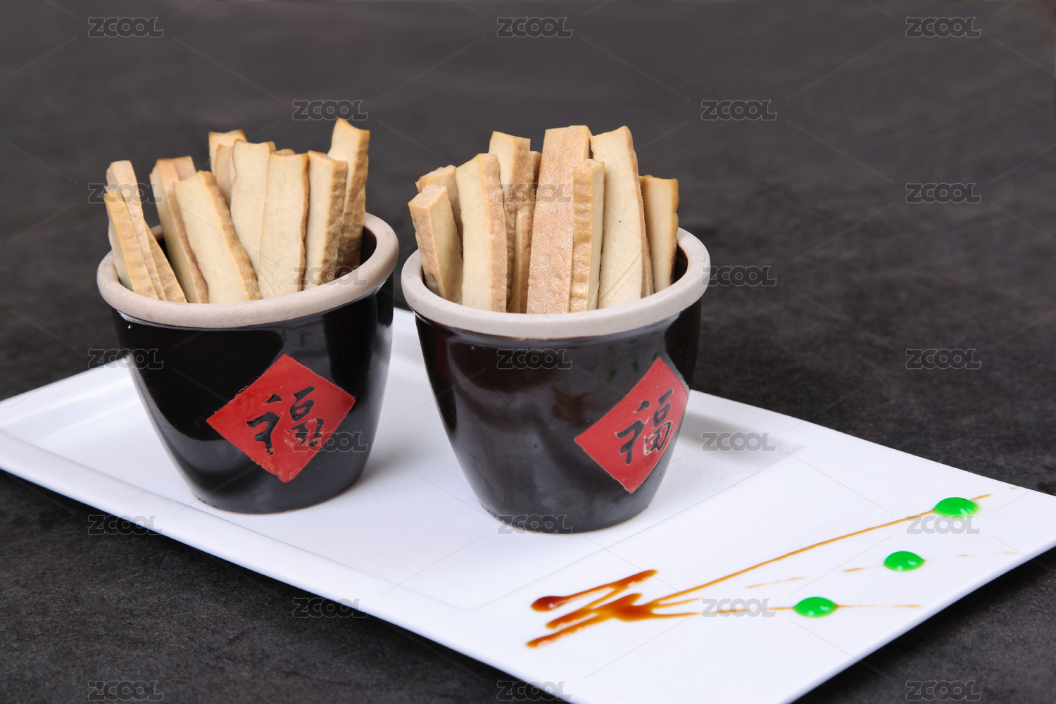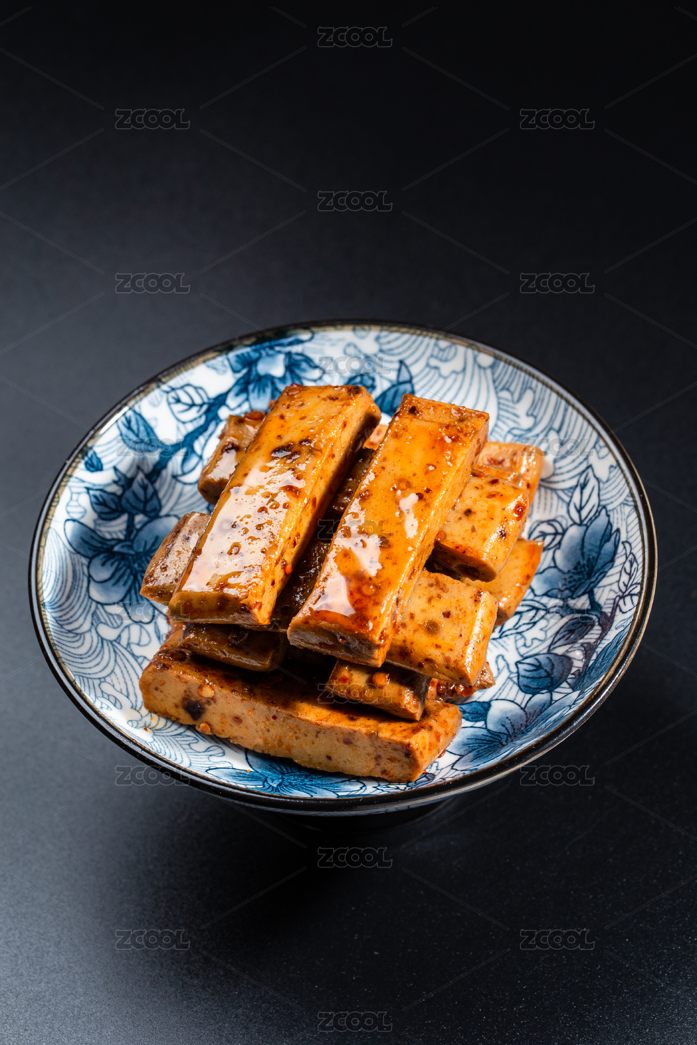 黑色背景青花瓷碟子上的香鹵豆腐