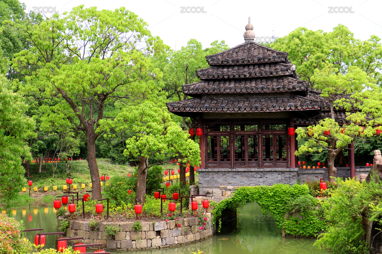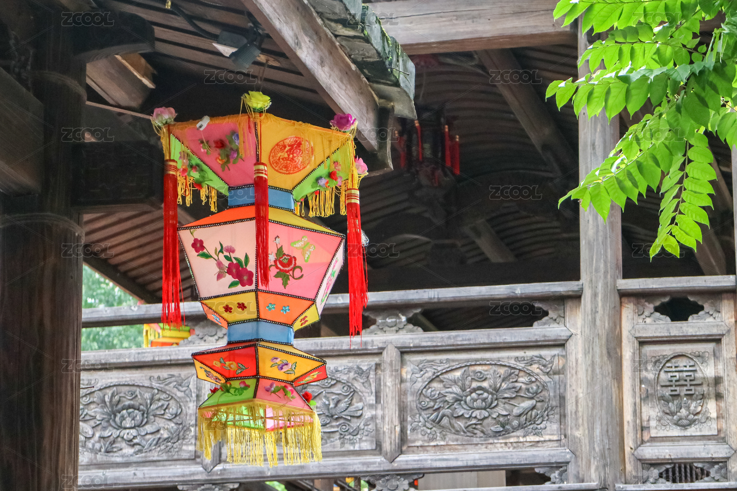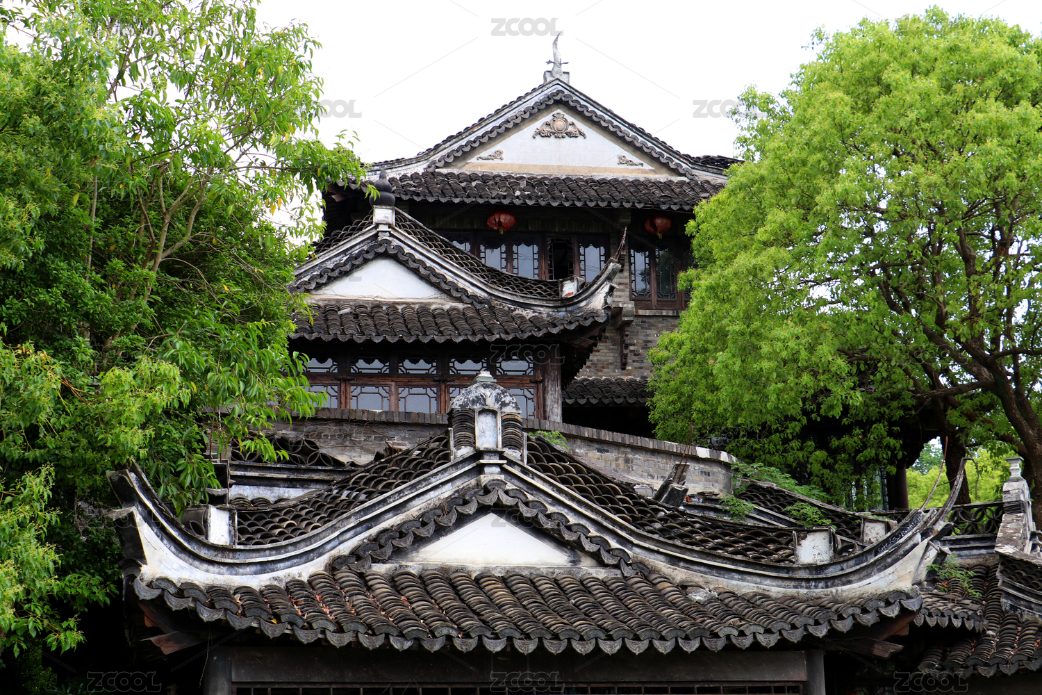 樹(shù)葉及紅燈籠點(diǎn)綴的翹檐古閣一角