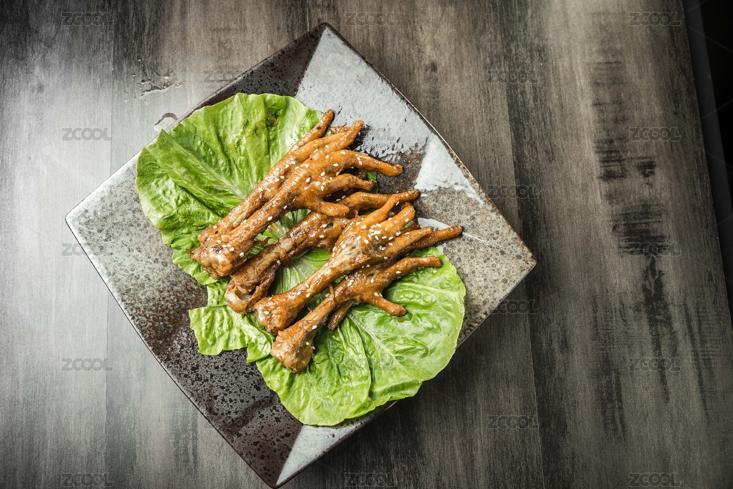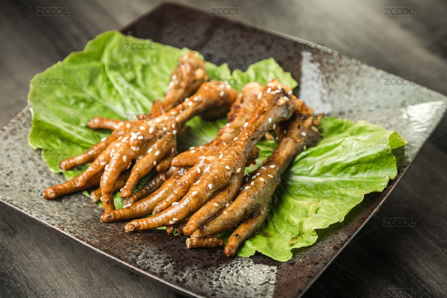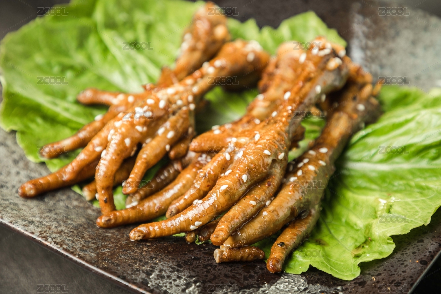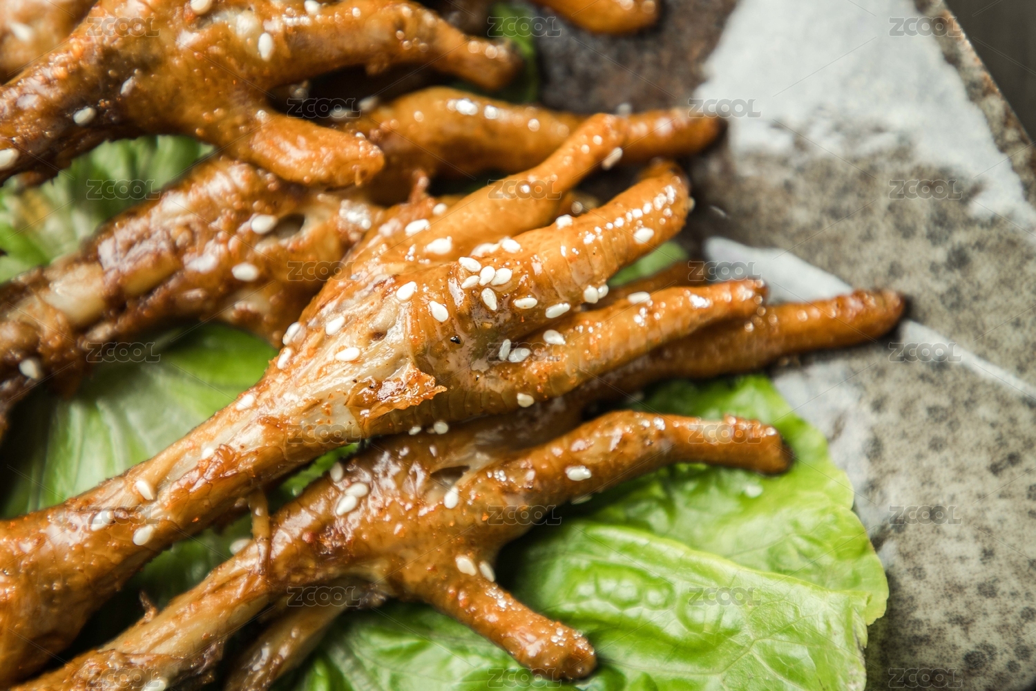 暗色木紋桌上放著一盤撒著白芝麻的醬雞爪
