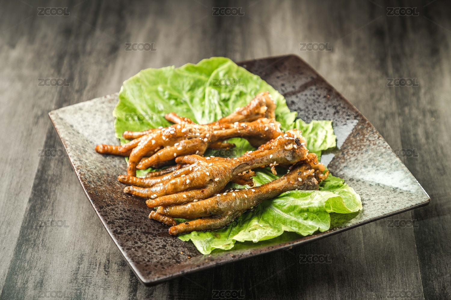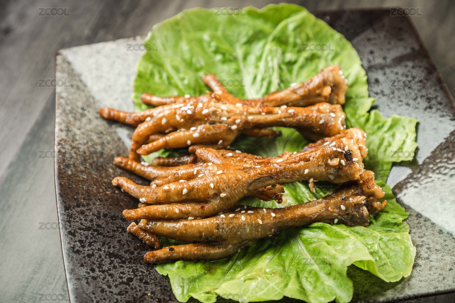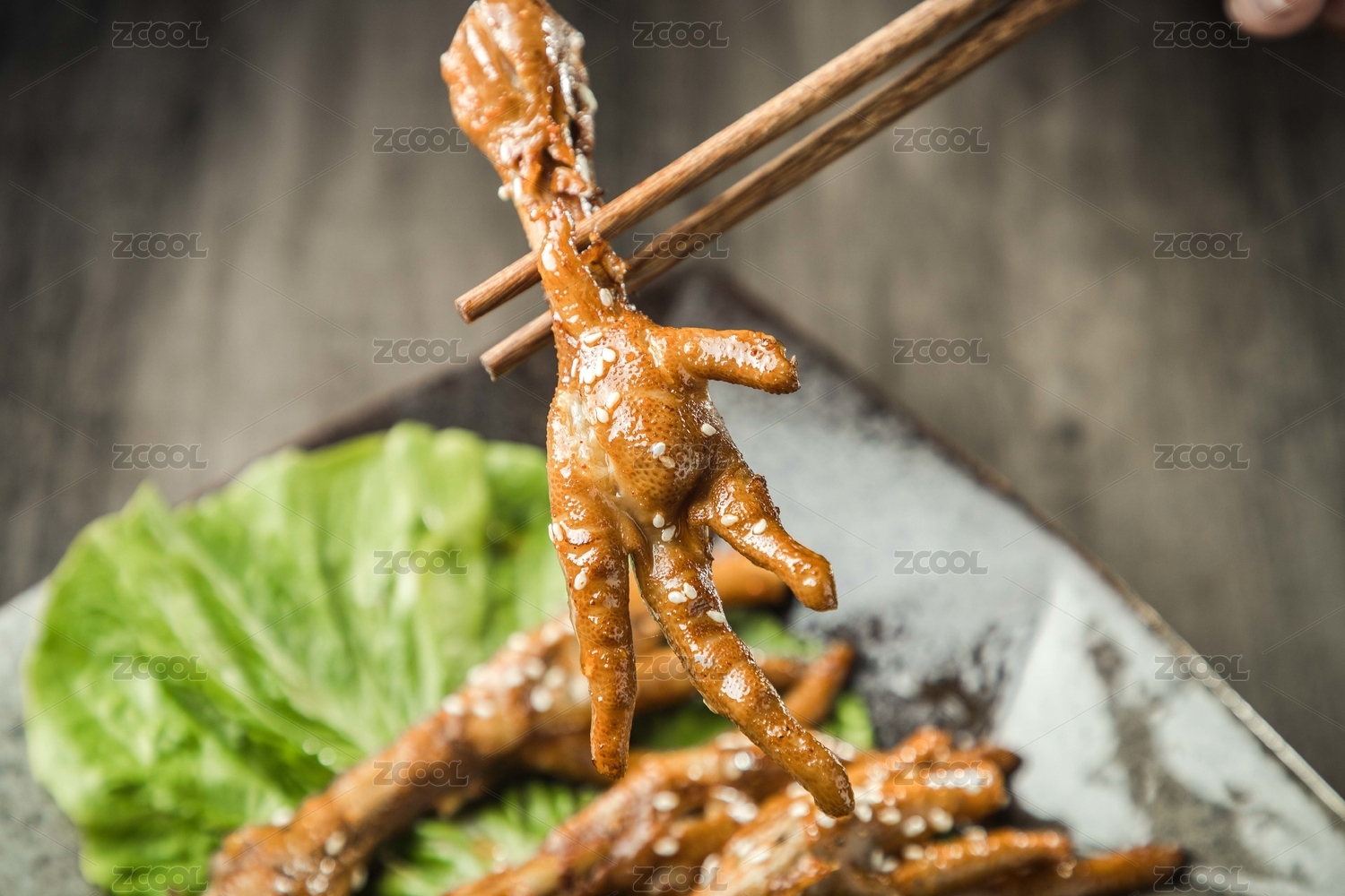暗色木紋桌上放著一盤撒著白芝麻的醬雞爪