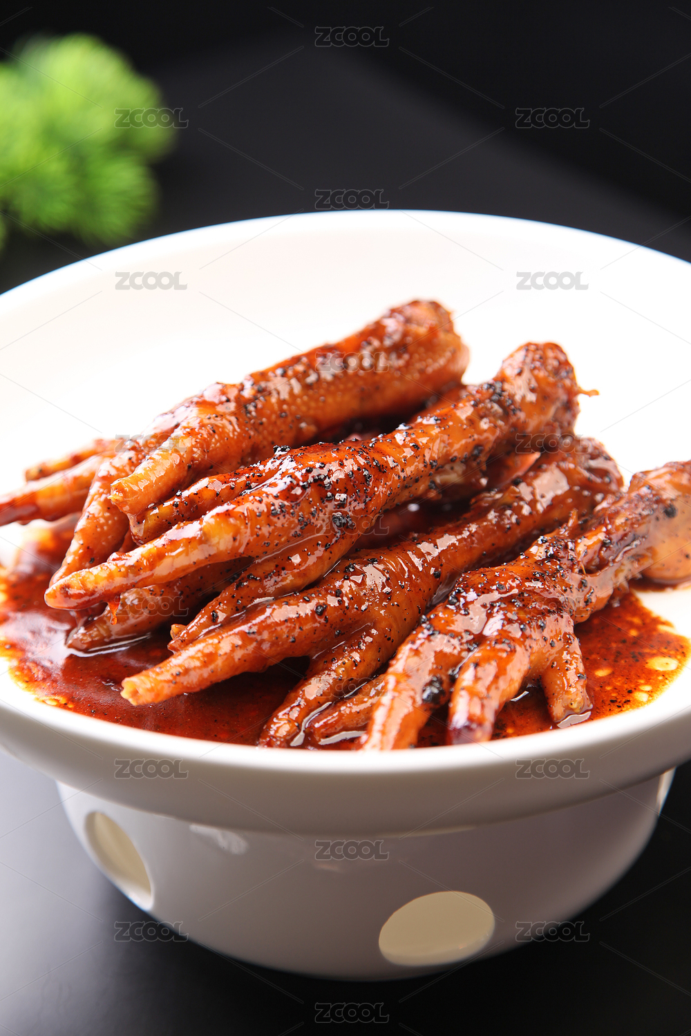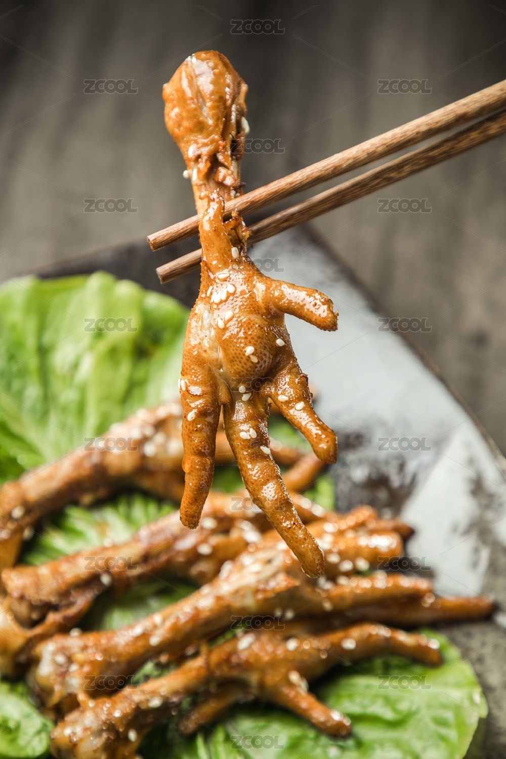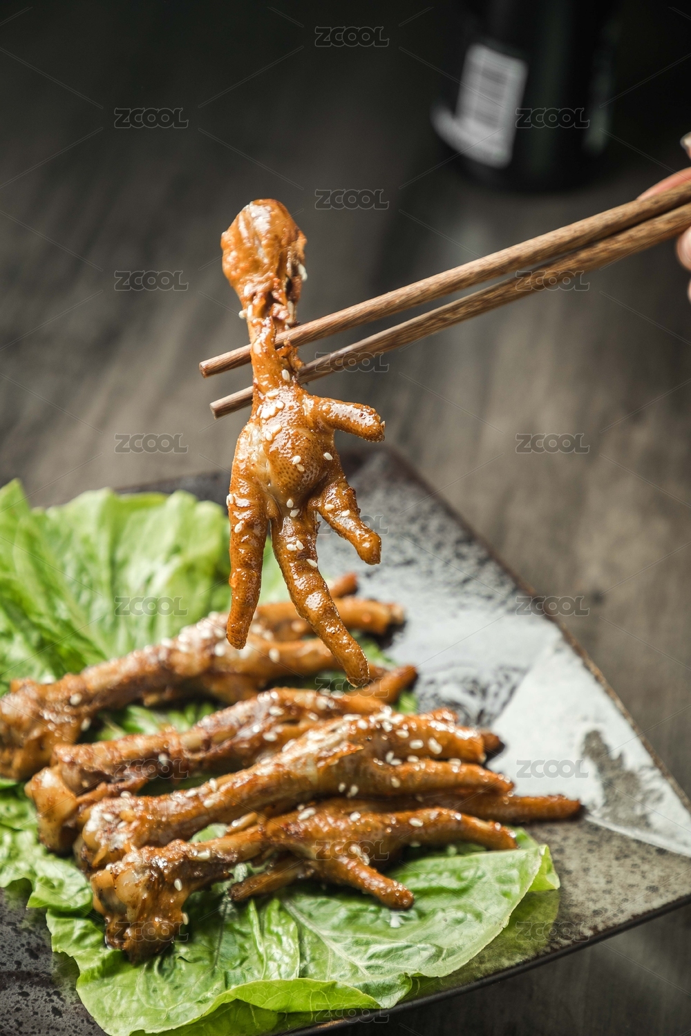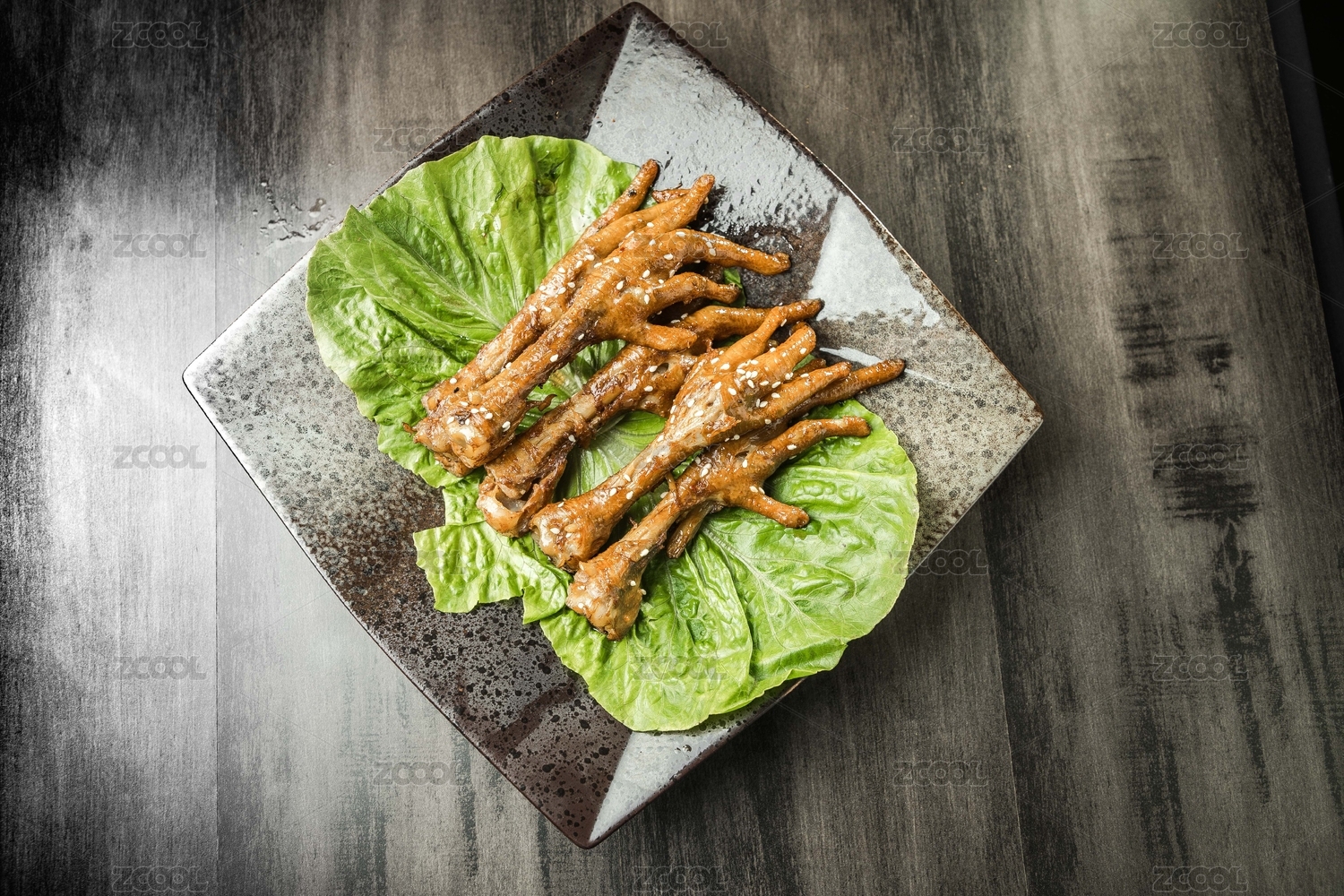 暗色木紋桌上放著一盤撒著白芝麻的醬雞爪