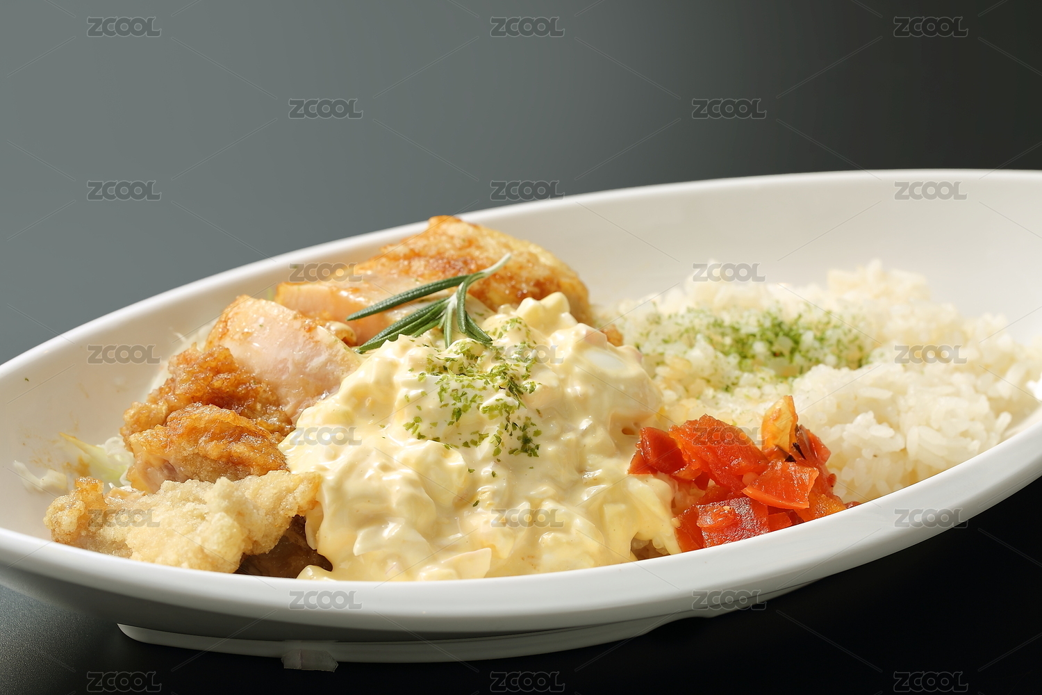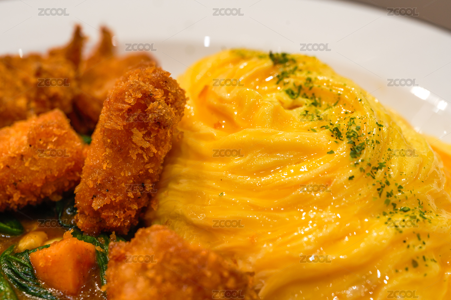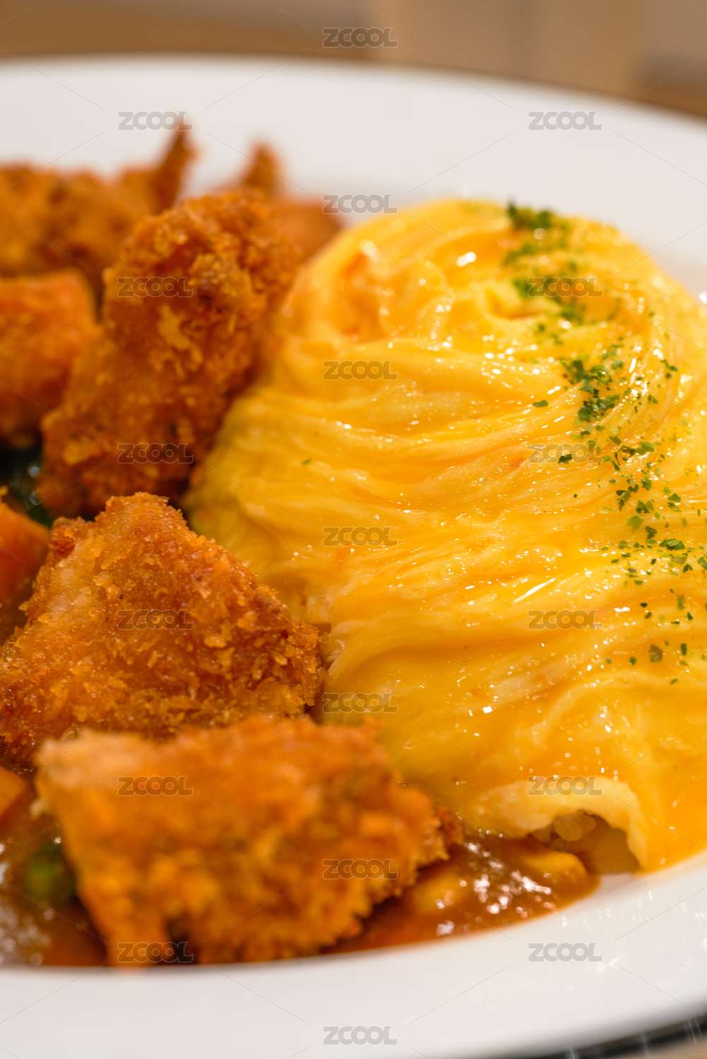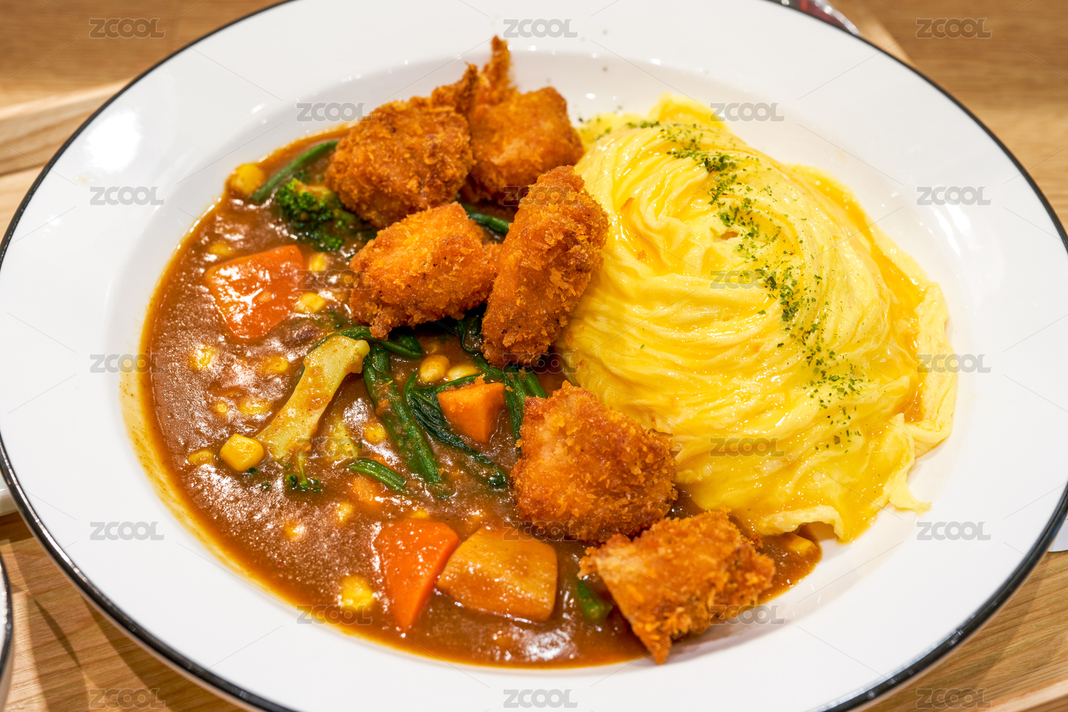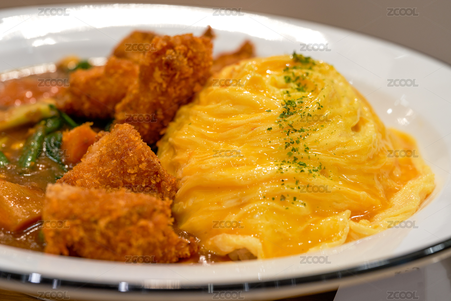 一份誘人美味的日式咖喱炸雞塊蛋包飯