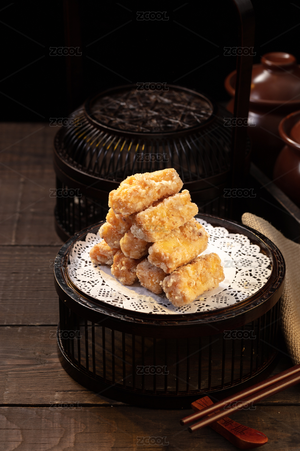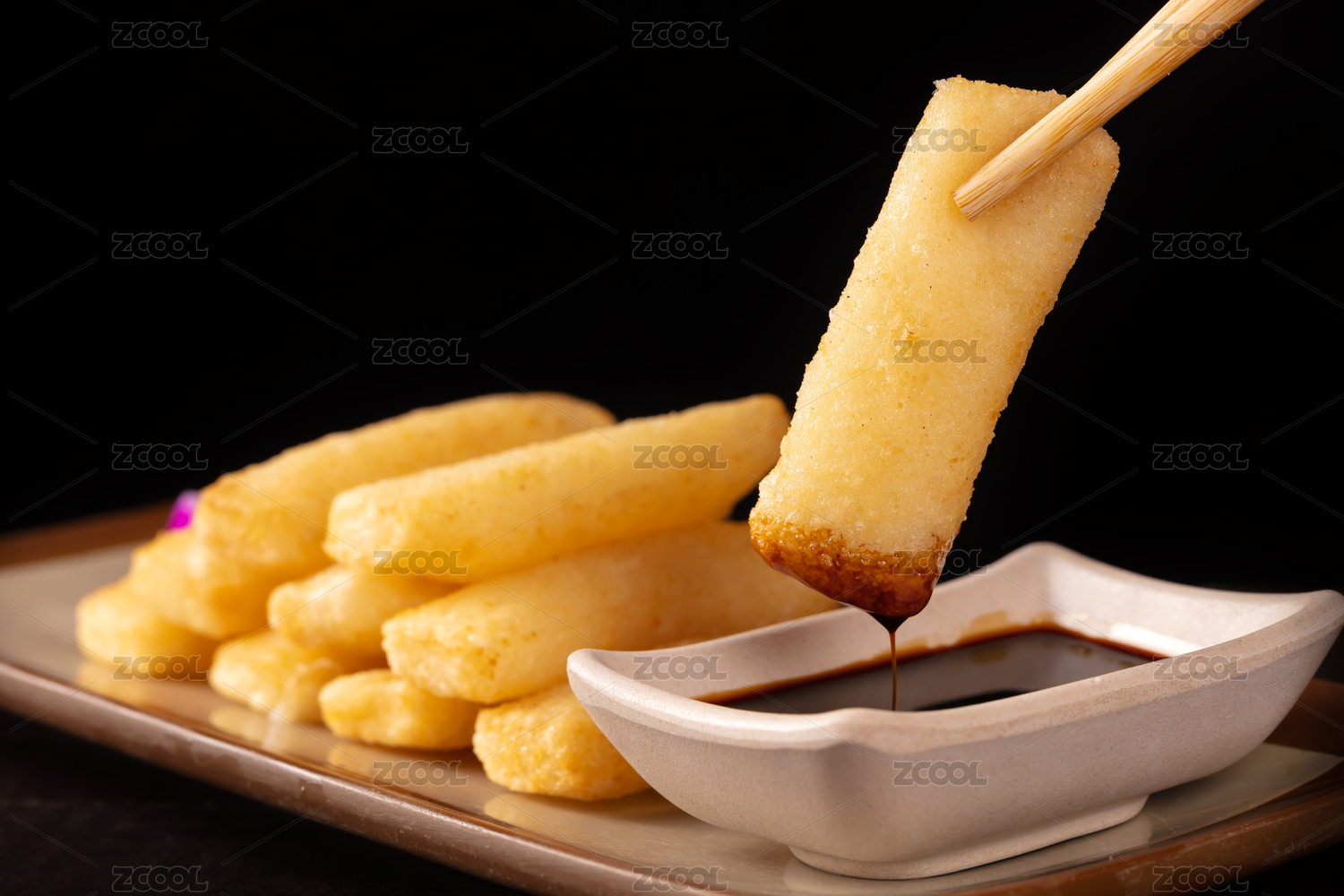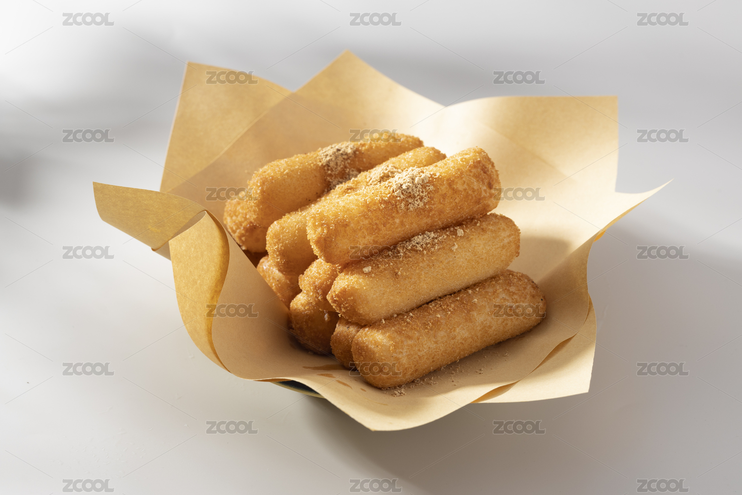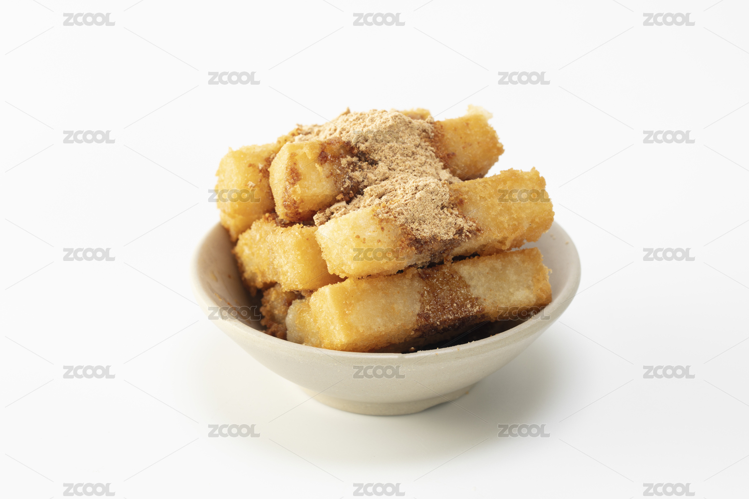 盤子里的火鍋店小吃油炸糍粑條蘸紅糖