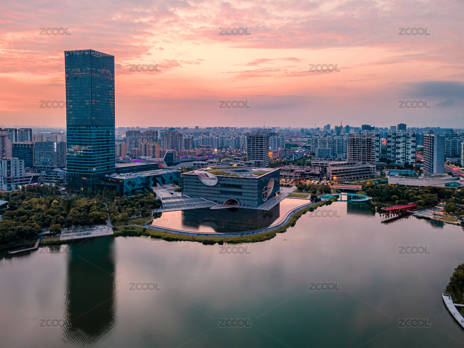 上海嘉定遠(yuǎn)香湖黃昏航拍