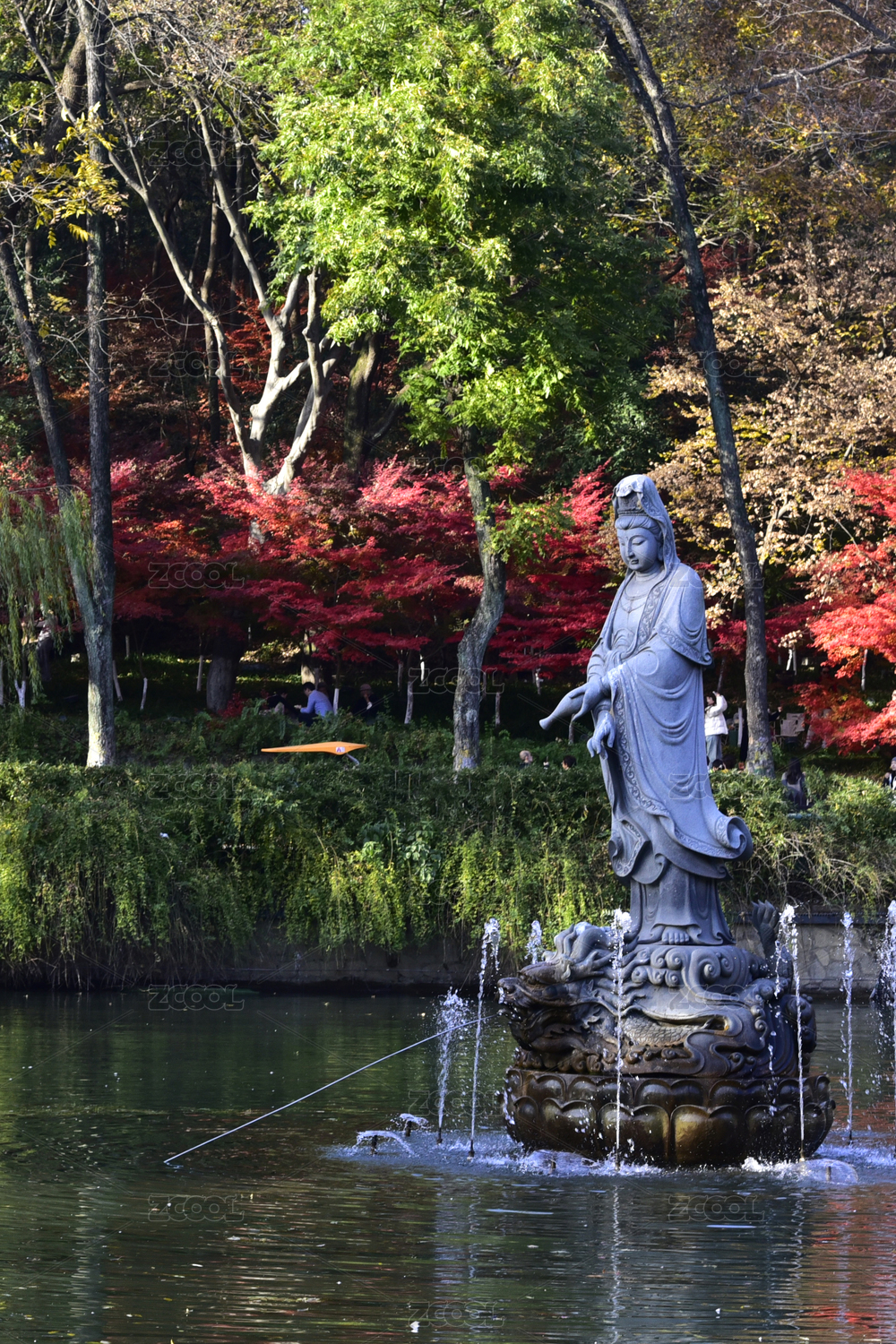 南京棲霞山秋季明鏡湖上的觀(guān)音塑像