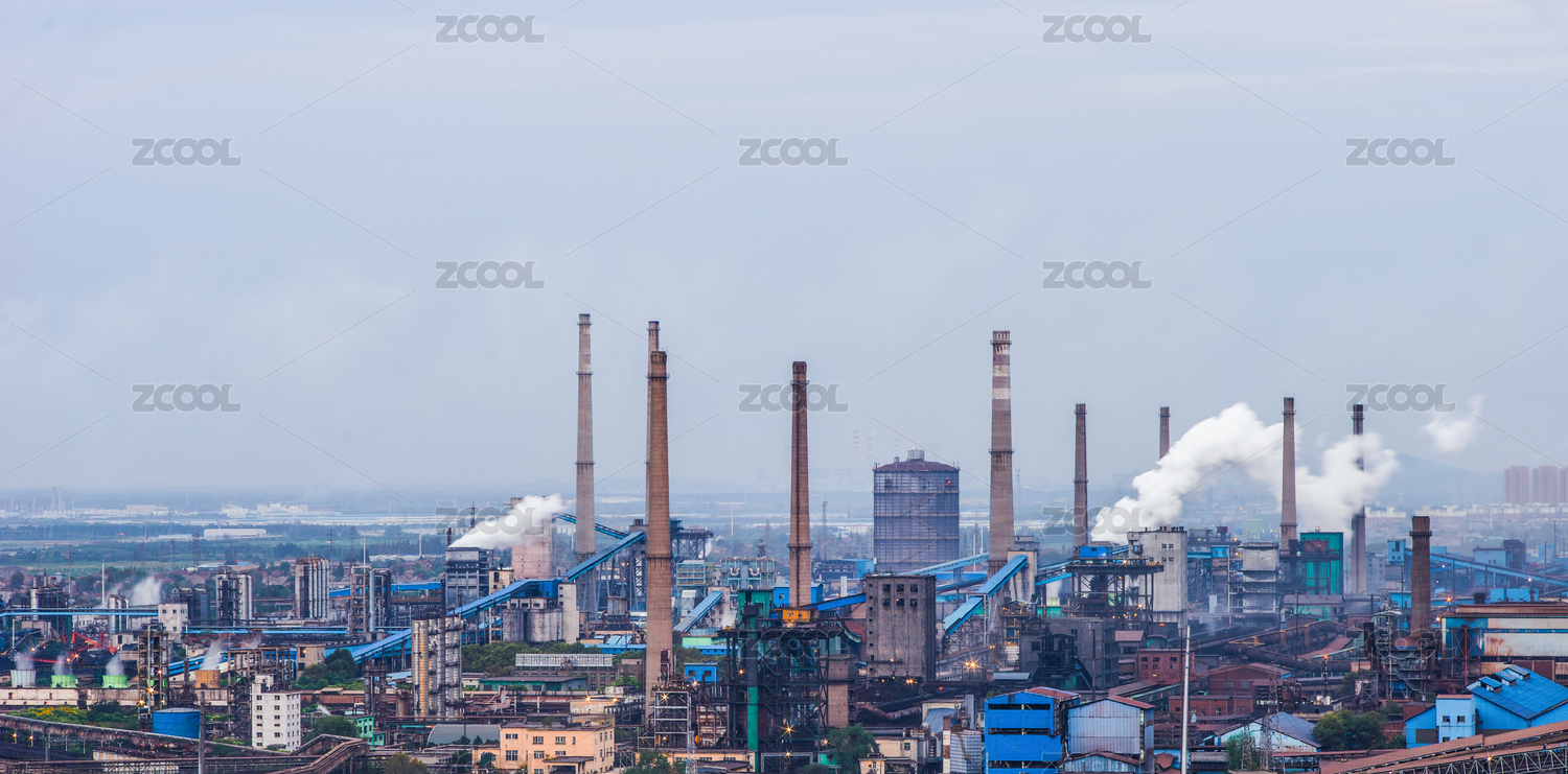 工業(yè)區(qū)廠房遠(yuǎn)景煙囪冒出濃煙景象