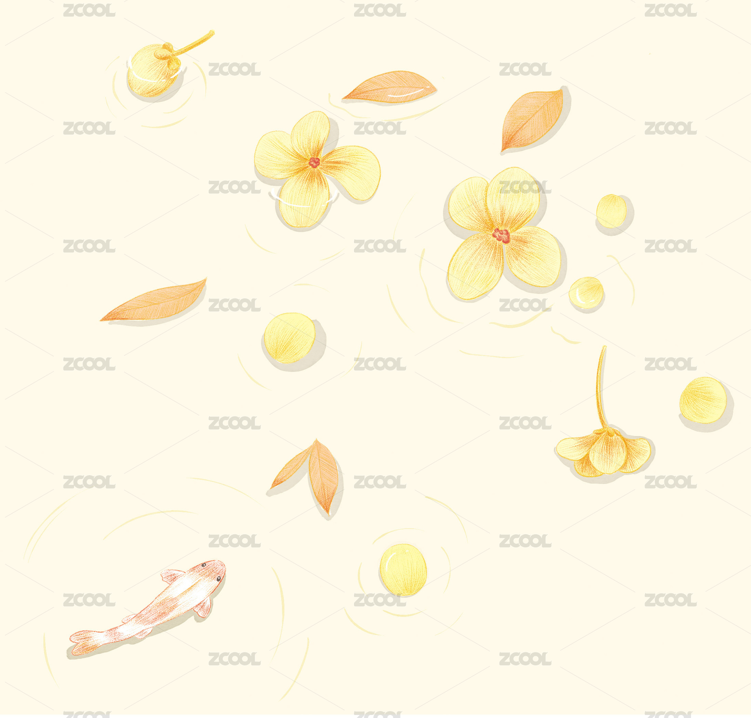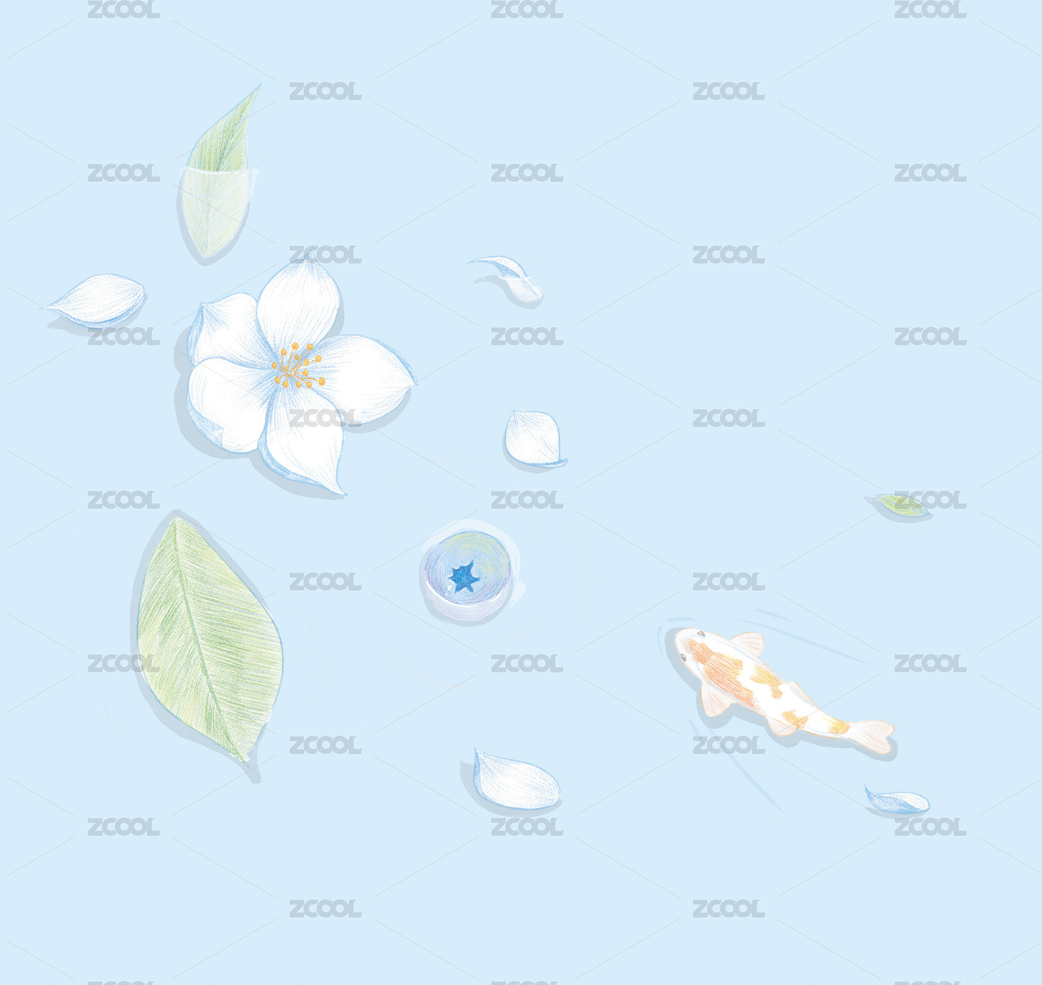 荷塘游魚水彩插畫