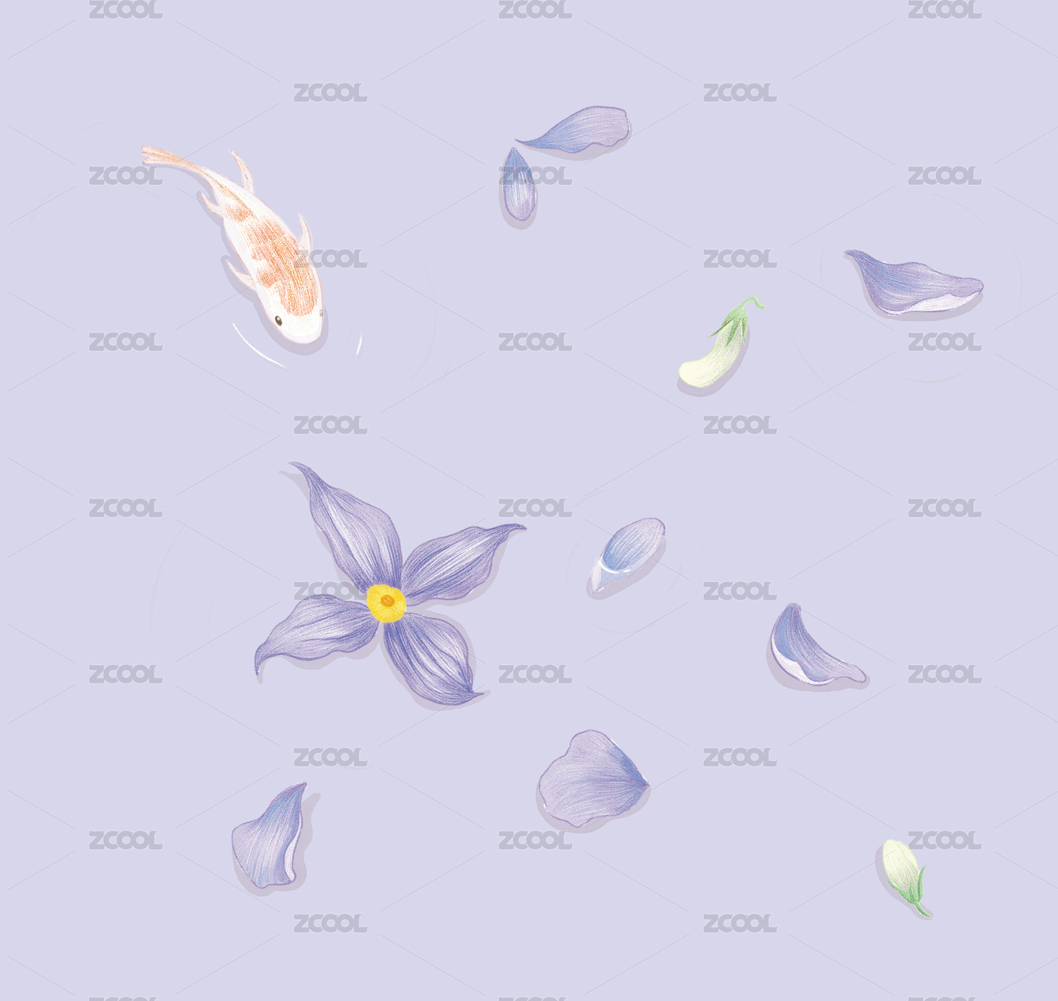 水中落花與游魚錦鯉
